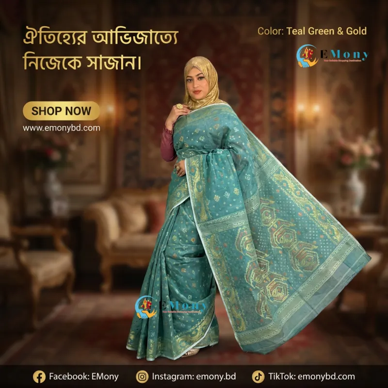 প্রিমিয়াম সিল্ক জামদানি শাড়ি (Premium Silk Jamdani Saree) বাঙালি ঐতিহ্যের সাথে আধুনিক আভিজাত্যের এক অনন্য সংমিশ্রণ। এই শাড়ির প্রতিটি সুতোয় রয়েছে সোনালী জরির (Golden Zari) নিখুঁত ও চমৎকার কারুকাজ, যা উৎসবের আলোয় আপনাকে করে তুলবে আরও আকর্ষণীয়। উন্নত মানের সফট সিল্ক ফেব্রিক ব্যবহার করায় এটি পরতে অত্যন্ত আরামদায়ক এবং সহজে গায়ের সাথে মিশে থাকে। বিয়ের অনুষ্ঠান, বিশেষ উৎসব বা ফর্মাল ইভেন্টের জন্য এটি একটি কালজয়ী পোশাক। টেকসই বুনন এবং রাজকীয় ডিজাইনের এই জামদানি শাড়িটি আপনার ওয়ার্ডরোবে আভিজাত্যের এক নতুন মাত্রা যোগ করবে।