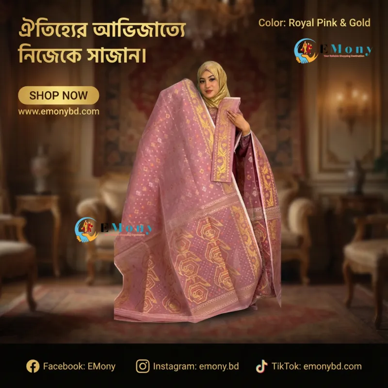 সোনালী জরির নিখুঁত কারুকাজ এবং উন্নত মানের সিল্ক কাপড়ে তৈরি এই শাড়িটি বিবাহ বা যেকোনো উৎসবে আপনাকে দেবে এক রাজকীয় ও আভিজাত্যপূর্ণ লুক।