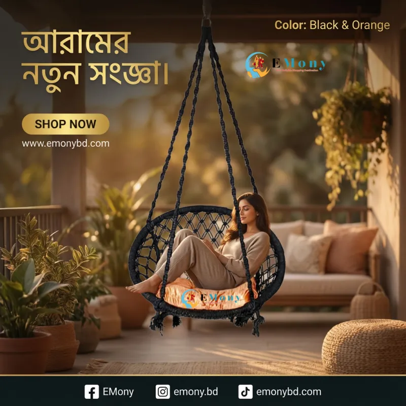 উন্নত মানের কটন রোপে তৈরি এই দোলনা চেয়ারটি ঘর বা ব্যালকনির সৌন্দর্য বাড়ায়। এটি আরামদায়ক, টেকসই এবং ইনডোর-আউটডোর ব্যবহারের উপযোগী।
