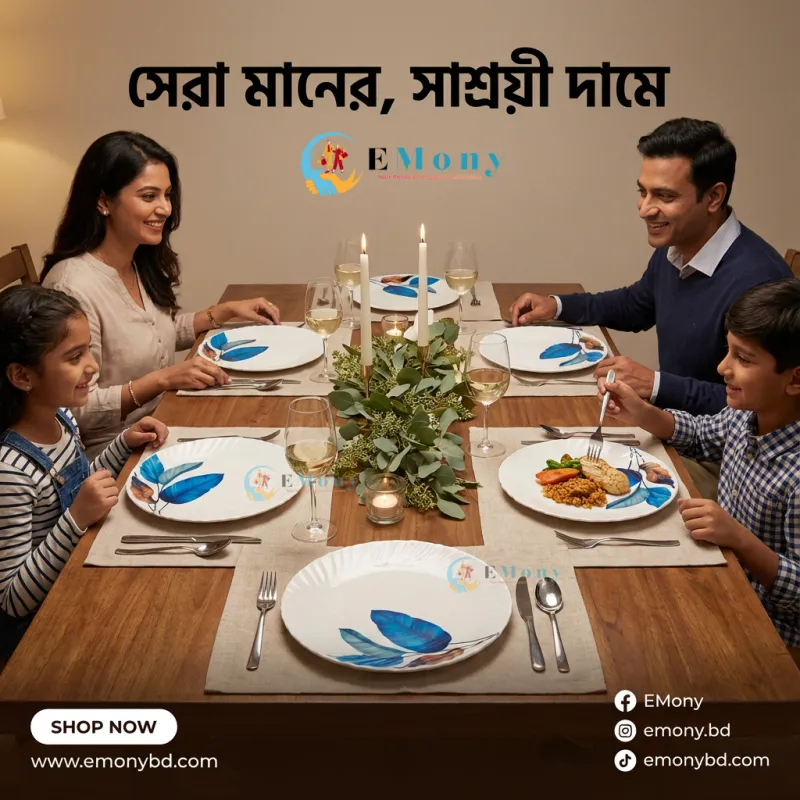 প্রিমিয়াম কোয়ালিটি মেলামাইনে তৈরি এই প্লেটগুলো সহজে ভাঙে না এবং আকর্ষণীয় নীল পাতার ডিজাইন আপনার ডাইনিংকে করে তোলে অনন্য।