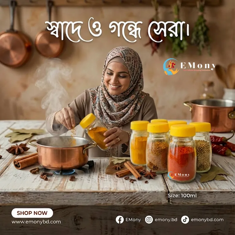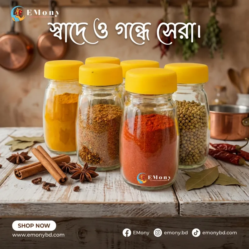 ১০০ মি.লি. মশলা রাখার গ্লাস জার সেট: এই প্রিমিয়াম কম্বো সেটে মশলা থাকবে সতেজ ও স্বাস্থ্যসম্মত। এয়ার-টাইট ঢাকনাসহ এই জারগুলো আপনার রান্নাঘরকে করবে পরিপাটি।