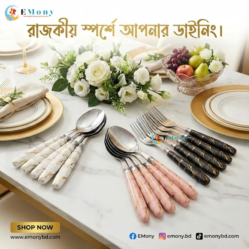 স্টেইনলেস স্টিল ও সিরামিক স্টাইল সিলিকন হ্যান্ডেলের সমন্বয়ে তৈরি এই চামচ ও কাঁটাচামচ সেটটি আপনার ডাইনিংয়ে আনবে আভিজাত্যের ছোঁয়া।