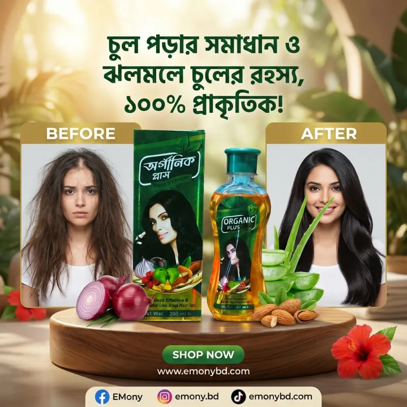 আপনার চুলের যাবতীয় সমস্যার প্রাকৃতিক সমাধান দিতে অর্গানিক প্লাস হার্বাল হেয়ার অয়েল (Organic Plus Herbal Hair Oil) বিশেষভাবে তৈরি। এটি বাছাইকৃত ভেষজ উপাদানের নির্যাস থেকে প্রস্তুত, যা চুলের গভীরে পুষ্টি পৌঁছে দেয় এবং রক্ত সঞ্চালন বৃদ্ধি করে। নিয়মিত ব্যবহারে এটি মাত্র কয়েক সপ্তাহেই উল্লেখযোগ্যভাবে চুল পড়া কমিয়ে আনে এবং সুপ্ত ফলিকলকে জাগ্রত করে নতুন চুল গজাতে (Hair Regrowth) সহায়তা করে। খুশকি দূর করতে এবং চুলকে সিল্কি ও উজ্জ্বল করতে এই তেলের জুড়ি নেই। কোনো কৃত্রিম সুগন্ধি বা ক্ষতিকর কেমিক্যাল নেই বলে এটি ছোট-বড় সবার ব্যবহারের জন্য সম্পূর্ণ নিরাপদ একটি আয়ুর্বেদিক হেয়ার টনিক।