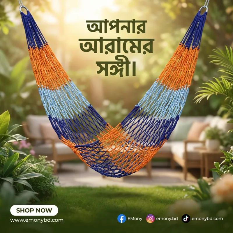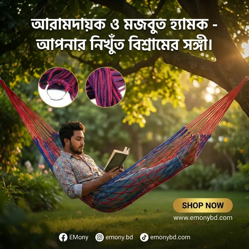 বিশ্রাম বা অবসরের সময়কে আনন্দদায়ক করতে প্রিমিয়াম আউটডোর পোর্টেবল হ্যাঙ্গিং হ্যামক রিং দোলনা (Premium Outdoor Portable Hanging Hammock Ring Dolna) একটি চমৎকার সমাধান। এই দোলনাটির বিশেষত্ব হলো এর মজবুত রিং ডিজাইন, যা একে আরও ভারসাম্যপূর্ণ এবং নিরাপদ করে তোলে। উচ্চমানের মোটা ক্যানভাস ফেব্রিক এবং শক্তিশালী দড়ি দিয়ে তৈরি এই হ্যামকটি দীর্ঘস্থায়ী এবং অনেক ওজন বহন করতে সক্ষম। এর মাল্টিকালার ডিজাইন ঘরের ড্রয়িং রুম, বারান্দা বা বাগানের শোভা বহুগুণ বাড়িয়ে দেয়। এটি ওজনে হালকা এবং সহজে বহনযোগ্য হওয়ায় ক্যাম্পিং বা পিকনিকের জন্য এটি একটি আদর্শ অনুষঙ্গ। খুব সহজেই যেকোনো হুক বা গাছের ডালে এটি ঝুলিয়ে আপনি নিতে পারেন চমৎকার দোলনার অভিজ্ঞতা।