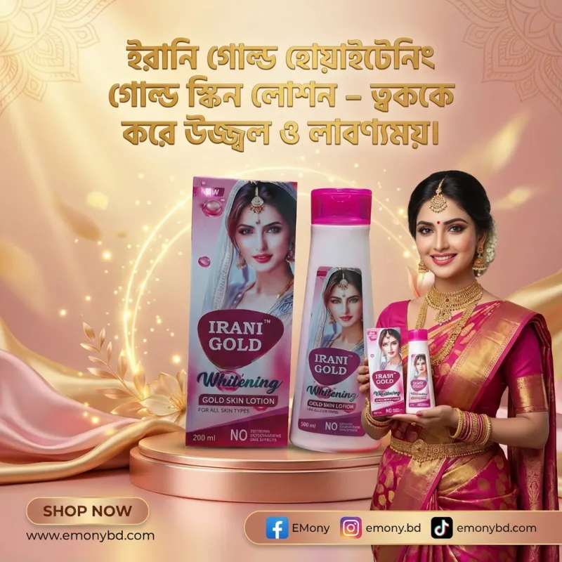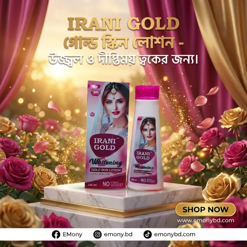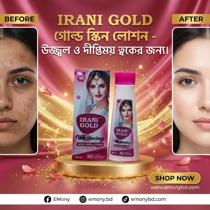 ত্বকের লাবণ্য এবং ফর্সা ভাব ফিরিয়ে আনতে ইরানি গোল্ড হোয়াইটেনিং গোল্ড স্কিন লোশন (Irani Gold Whitening Gold Skin Lotion) একটি অতুলনীয় পণ্য। এটি বিশেষ ইরানি ফর্মুলায় তৈরি, যা ত্বকের গভীর স্তরে পৌঁছে পুষ্টি সরবরাহ করে। এতে থাকা গোল্ডেন পার্টিকেলস ত্বককে উজ্জ্বল করার পাশাপাশি ত্বকের স্থিতিস্থাপকতা বজায় রাখে, ফলে ত্বক দেখায় টানটান ও তরুণ। এই লোশনটি ত্বকের কালচে দাগ, পিগমেন্টেশন এবং খসখসে ভাব দূর করে ত্বককে রেশমের মতো নরম ও মসৃণ করে তোলে। এটি তেলতেলে ভাবমুক্ত (Non-sticky), তাই গরম বা শীত সব ঋতুতেই এবং সব ধরনের ত্বকে নিশ্চিন্তে ব্যবহার করা যায়।