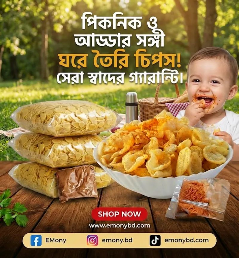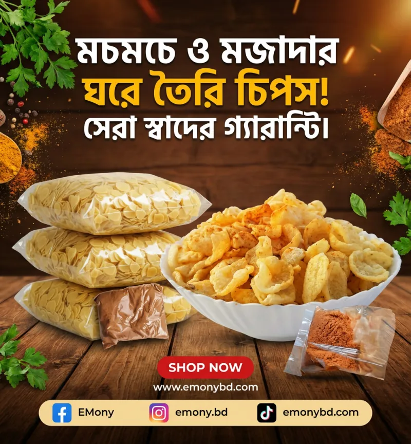 একদম ফ্রেশ আলু ও আমাদের নিজস্ব সিক্রেট মশলায় তৈরি এই চিপসগুলো অত্যন্ত মুচমুচে ও সুস্বাদু। কোনো প্রিজারভেটিভ ছাড়াই তৈরি স্বাস্থ্যসম্মত স্ন্যাকস।