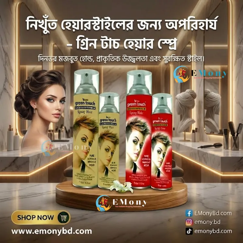 চুলের স্টাইলকে দীর্ঘক্ষণ নষ্ট হতে না দিতে গ্রিন টাচ আল্ট্রা হোল্ড হেয়ার স্টাইলিং স্প্রে (Green Touch Ultra Hold Hair Styling Spray) একটি নির্ভরযোগ্য সমাধান। এটি বিশেষভাবে তৈরি করা হয়েছে যাতে চুলের প্রতিটি স্ট্র্যান্ডকে শক্তভাবে ধরে রাখে কিন্তু দেখতে একদম স্বাভাবিক বা ন্যাচারাল মনে হয়। এর বিশেষ ফর্মুলা চুলে একটি চমৎকার জেল্লা বা "Natural Shine" যোগ করে, যা আপনার লুককে করে তোলে আরও আকর্ষণীয়। এটি দ্রুত শুকিয়ে যায় এবং চুলে কোনো সাদা আস্তরণ বা চিটচিটে ভাব তৈরি করে না। বাতাস বা আর্দ্রতাতেও চুলের সেট নষ্ট হয় না, তাই দীর্ঘ সময়ের অনুষ্ঠান বা ভ্রমণের জন্য এটি উপযুক্ত। পুরুষ ও মহিলা উভয়েই যেকোনো ধরনের হেয়ারস্টাইল সেট করতে এটি ব্যবহার করতে পারেন।