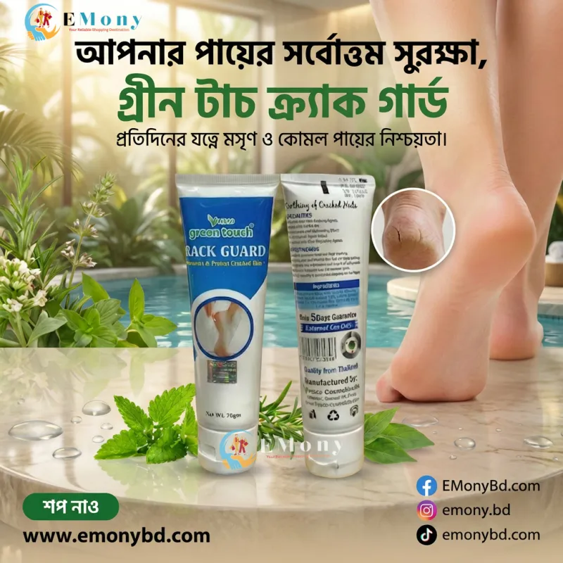 পা ফাটা এবং গোড়ালির রুক্ষতা দূর করতে গ্রিন টাচ ক্র্যাক গার্ড ফুট ক্রিম (Green Touch Crack Guard Foot Cream) একটি কার্যকরী সমাধান। শীতকাল বা শুষ্ক আবহাওয়ায় পায়ের গোড়ালি ফেটে যাওয়া একটি সাধারণ সমস্যা, যা এই ক্রিমটি নিয়মিত ব্যবহারে দ্রুত সেরে ওঠে। এর বিশেষ হিলিং ফর্মুলা ত্বকের ফাটা অংশ পূরণ করে এবং মৃত কোষ দূর করে পা-কে নরম ও রেশমী করে তোলে। এটি ত্বকের গভীরে পৌঁছে প্রয়োজনীয় আর্দ্রতা যোগায় এবং পায়ের ত্বককে পুনরায় ফাটল ধরা থেকে রক্ষা করে। নন-গ্রিজি টেক্সচারের কারণে এটি ব্যবহারের পর অস্বস্তিকর আঠালো ভাব লাগে না। মাত্র কয়েক দিনের ব্যবহারে আপনার পা হবে লক্ষণীয়ভাবে সুন্দর ও কোমল।