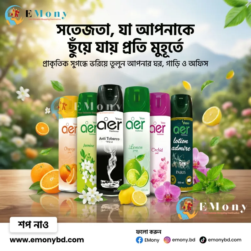 আপনার ঘর বা কর্মক্ষেত্রের পরিবেশকে সতেজ ও প্রাণবন্ত রাখতে ফ্রেসকো এয়ার প্রিমিয়াম এয়ার ফ্রেশনার (Fresko aer Premium Air Freshener) একটি সেরা পছন্দ। এটি উন্নত প্রযুক্তিতে তৈরি যা বাতাসের দুর্গন্ধকে ঢেকে না দিয়ে সরাসরি দূর করে। আপনার পছন্দ অনুযায়ী এতে রয়েছে Orange, Jasmine, Anti-Tobacco, Lemon, Orchid, এবং Lotion Admire Paris-এর মতো বৈচিত্র্যময় ফ্লেভার। বিশেষ করে 'অ্যান্টি-টোব্যাকো' ভেরিয়েন্টটি ধূমপানের গন্ধ দূর করতে অত্যন্ত কার্যকর। এর প্রতিটি স্প্রে দীর্ঘ সময় স্থায়ী হয় এবং এক রাজকীয় সুগন্ধি আবেশ ছড়িয়ে দেয়। লিভিং রুম, বেডরুম কিংবা ওয়াশরুম—যেকোনো স্থানকে তাৎক্ষণিক রিফ্রেশ করতে এই ৩০০ মি.লি. প্যাকটি অত্যন্ত সাশ্রয়ী ও কার্যকরী।