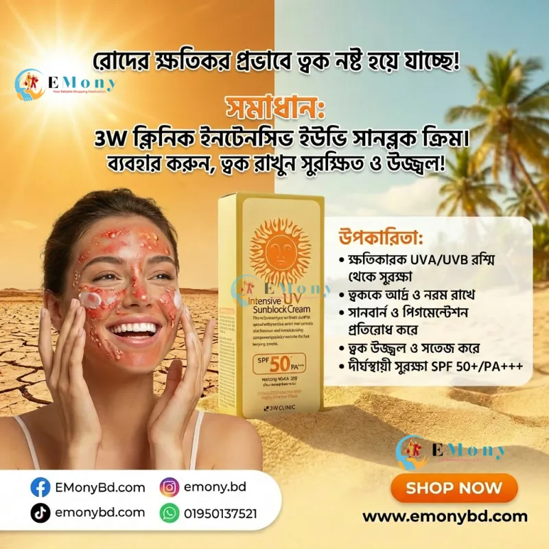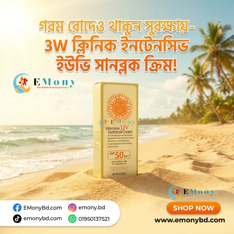 সূর্যের ক্ষতিকর আল্ট্রাভায়োলেট রশ্মি থেকে ত্বককে সুরক্ষিত রাখতে 3W ক্লিনিক ইনটেনসিভ ইউভি সানব্লক ক্রিম (3W Clinic Intensive UV Sunblock Cream) একটি জনপ্রিয় কোরিয়ান স্কিনকেয়ার সমাধান। এর SPF 50+ PA+++ ফর্মুলা ত্বককে রোদে পোড়া (Sunburn) এবং অকাল বার্ধক্য (Aging) থেকে কার্যকরভাবে রক্ষা করে। এটি কেবল একটি সানস্ক্রিন নয়, এতে থাকা অ্যালোভেরা এবং রেড জিনসেং নির্যাস ত্বককে হাইড্রেটেড ও শান্ত রাখে। এর বিশেষ টেক্সচার ত্বকে সাদা আস্তরণ (White cast) ফেলে না এবং চিটচিটে ভাব ছাড়াই দীর্ঘক্ষণ স্থায়ী হয়। যারা প্রতিদিন রোদে বের হন বা মেকআপের নিচে একটি ভালো বেস চান, তাদের জন্য এই সানব্লকটি সেরা পছন্দ।