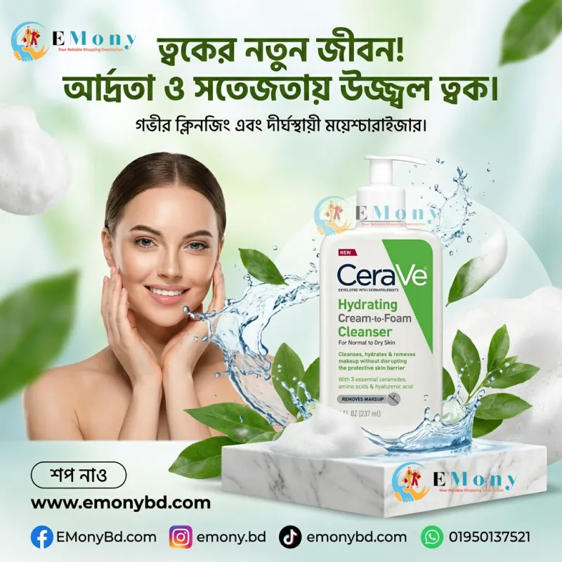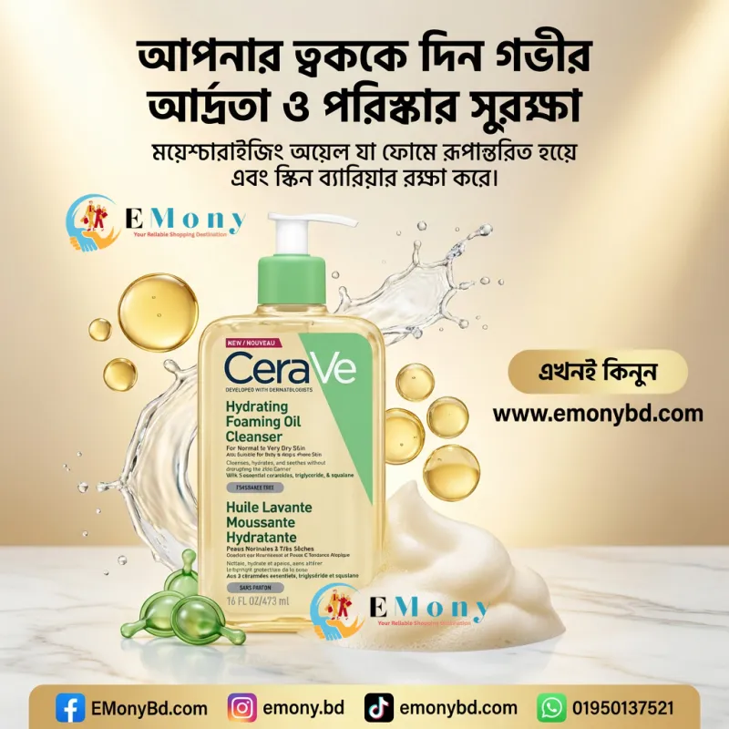 শুষ্ক ও সংবেদনশীল ত্বকের জন্য সেরাভি হাইড্রেটিং ফোমিং অয়েল ক্লিনজার (CeraVe Hydrating Foaming Oil Cleanser) একটি অত্যন্ত কার্যকর এবং কোমল ক্লিনজার। এর অনন্য অয়েল-টু-ফোম ফর্মুলা ত্বক থেকে মেকআপ, সানস্ক্রিন এবং অতিরিক্ত তেল দূর করে কোনো ধরনের টানটান অনুভূতি ছাড়াই। এতে রয়েছে স্কোয়ালেন অয়েল (Squalane Oil) এবং ট্রাইগ্লিসারাইড, যা ত্বককে পুষ্টি যোগায়। এছাড়াও এটি ৩টি এসেনশিয়াল সিরামাইড এবং হায়ালুরোনিক অ্যাসিড সমৃদ্ধ, যা ত্বকের ন্যাচারাল ব্যারিয়ার রক্ষা করে। এটি সাবানমুক্ত, সুগন্ধিমুক্ত এবং প্যারাফেন-মুক্ত হওয়ায় শিশু থেকে প্রাপ্তবয়স্ক—সবার ত্বকের জন্য এবং এমনকি অ্যাটোপিক-প্রবণ ত্বকেও ব্যবহারের উপযোগী।
