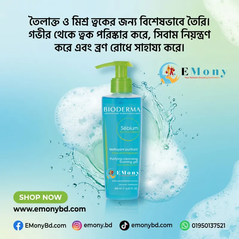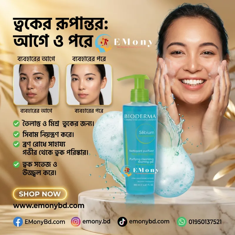 তৈলাক্ত এবং একনি-প্রবণ ত্বকের যত্নে বায়োডার্মা সেবিয়াম জেল মুসান্ত (Bioderma Sébium Gel Moussant) একটি বিশ্বস্ত নাম। এটি বিশেষভাবে তৈরি করা হয়েছে ত্বকের প্রাকৃতিক তেলের ভারসাম্য বজায় রেখে গভীর থেকে ময়লা পরিষ্কার করার জন্য। এর বিশেষ Fluidactiv™ কমপ্লেক্স সিবামের মান উন্নত করে, ফলে পোরস বা রোমকূপ বন্ধ হওয়া রোধ হয় এবং ব্রণের উপদ্রব কমে। এতে থাকা জিঙ্ক সালফেট এবং কপার সালফেট ত্বককে পিউরিফাই বা জীবাণুমুক্ত করে। এটি সোপ-ফ্রি এবং প্যারাবেন-মুক্ত, তাই ত্বক অতিরিক্ত শুষ্ক না করেই সতেজ অনুভূতি দেয়। সুস্থ ও ব্রণমুক্ত ত্বকের জন্য এই ক্লিনজারটি আপনার প্রতিদিনের রুটিনের সেরা অংশ হতে পারে।