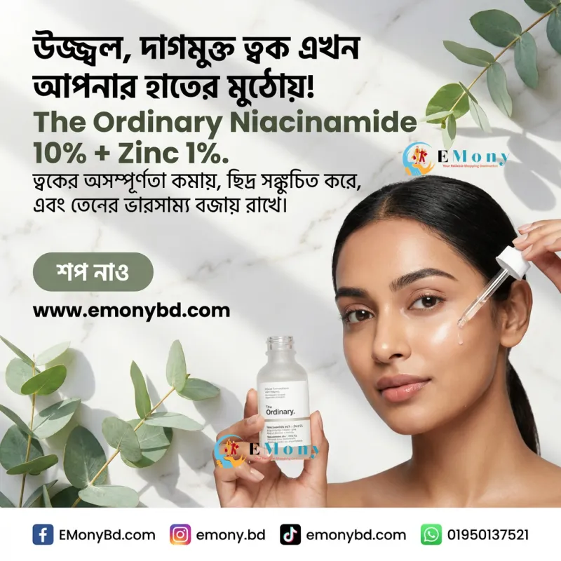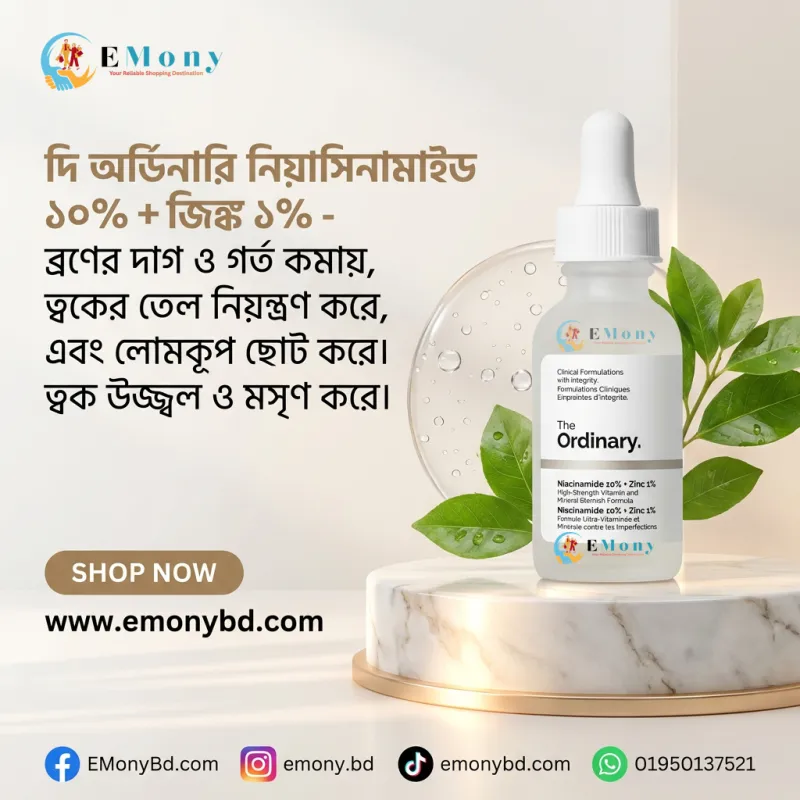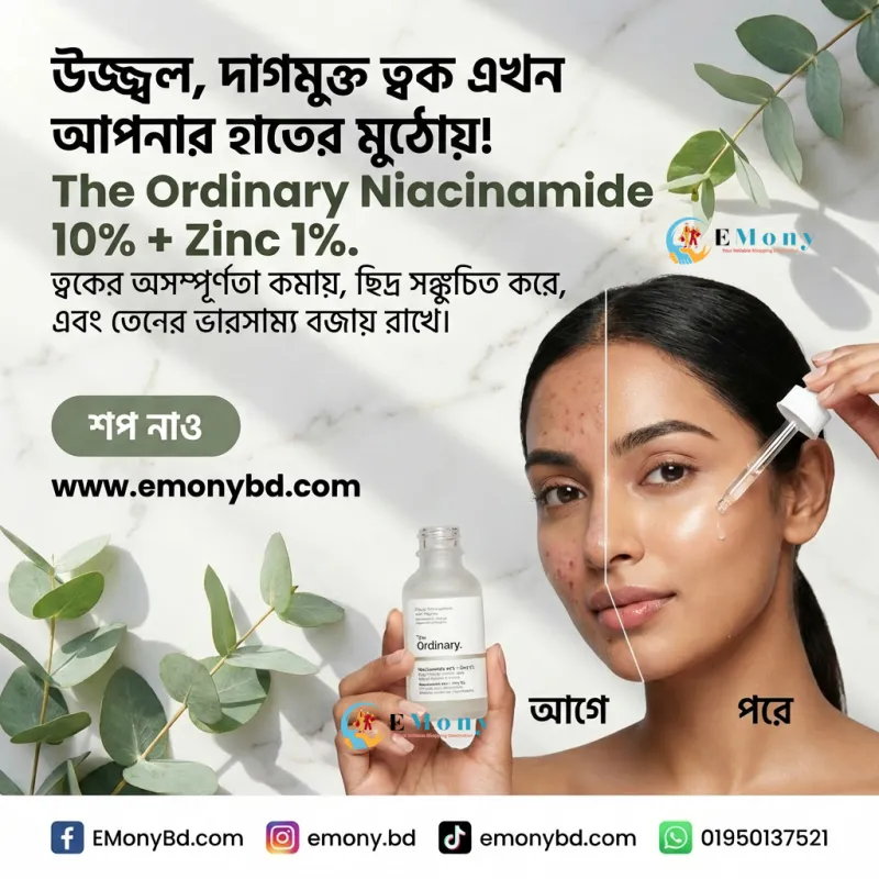 তৈলাক্ত এবং ব্রণপ্রবণ ত্বকের সমস্যার সমাধানে দি অর্ডিনারি নিয়াসিনামাইড ১০% + জিঙ্ক ১% (The Ordinary Niacinamide 10% + Zinc 1%) বিশ্বজুড়ে সর্বাধিক বিক্রিত একটি সিরাম। এতে থাকা উচ্চমাত্রার নিয়াসিনামাইড (ভিটামিন B3) ত্বকের সিবাম উৎপাদন ব্যালেন্স করে এবং কালচে দাগ দূর করে উজ্জ্বলতা বাড়ায়। পাশাপাশি জিঙ্ক (Zinc) ত্বকের প্রদাহ কমায় এবং ড্যামেজ স্কিন রিপেয়ার করতে সাহায্য করে। এটি ত্বকের বড় হয়ে যাওয়া লোমকূপ বা পোরস সংকুচিত করে টেক্সচার উন্নত করে। আপনি যদি সতেজ, দাগমুক্ত এবং তেলহীন পরিষ্কার ত্বক পেতে চান, তবে এই সিরামটি আপনার স্কিনকেয়ার রুটিনের জন্য অপরিহার্য। এটি সম্পূর্ণ প্যারাবেন ও অ্যালকোহল মুক্ত।