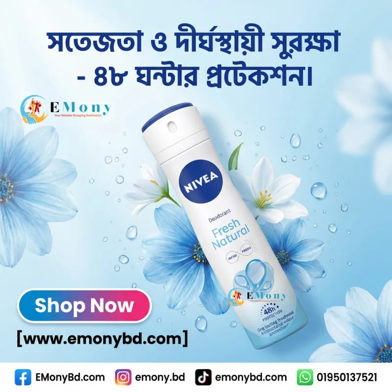 সারা দিন সতেজ এবং দুর্গন্ধমুক্ত থাকতে নিভিয়া ফ্রেশ ন্যাচারাল ডিওডোরেন্ট (Nivea Fresh Natural Deodorant) একটি নির্ভরযোগ্য সমাধান। এতে থাকা উন্নত Infini Fresh Technology এবং সমুদ্রের খনিজ নির্যাস (Ocean Extracts) আপনাকে দেয় ৪৮ ঘণ্টার দীর্ঘস্থায়ী সুরক্ষা। এটি ত্বকে কোনো কৃত্রিম রং বা প্রিজারভেটিভ ছাড়াই প্রাকৃতিক সতেজতা নিশ্চিত করে। নিভিয়ার এই ডিওডোরেন্টটি চর্মরোগ বিশেষজ্ঞ দ্বারা পরীক্ষিত, তাই এটি ত্বকের জন্য সম্পূর্ণ নিরাপদ এবং জ্বালাপোড়া মুক্ত। আপনি যদি এমন একটি বডি স্প্রে খুঁজছেন যা হালকা অথচ সতেজ সুগন্ধ দেবে এবং আপনার আত্মবিশ্বাস ধরে রাখবে, তবে এটি আপনার জন্য সেরা পছন্দ।