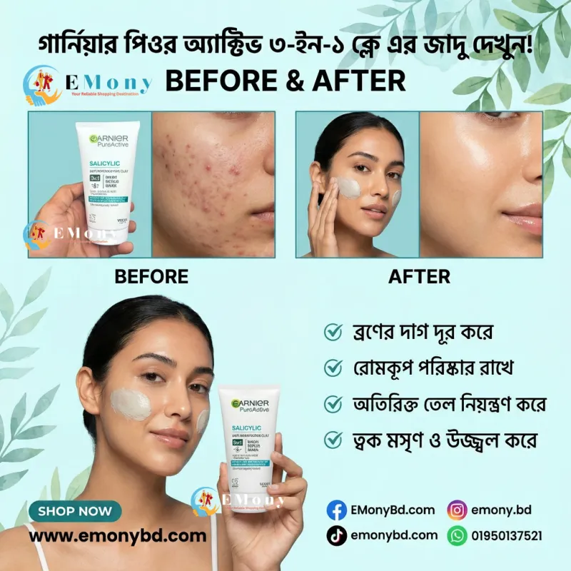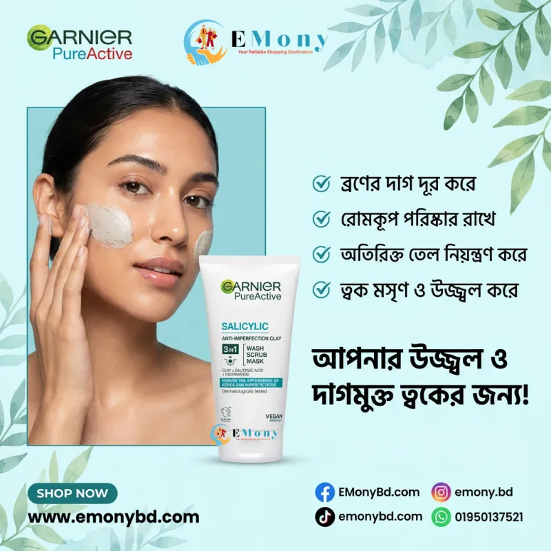 যাদের ত্বকে অতিরিক্ত তেল এবং ব্রণের সমস্যা রয়েছে, তাদের জন্য গার্নিয়ার পিওর অ্যাক্টিভ ৩-ইন-১ ক্লে (Garnier Pure Active 3-in-1 Anti-Imperfection Clay) একটি অল-ইন-ওয়ান সমাধান। এতে রয়েছে স্যালিসাইলিক অ্যাসিড, যা ব্রণের বিরুদ্ধে লড়াই করে এবং নিয়াসিনামাইড, যা ত্বকের দাগ দূর করে উজ্জ্বলতা বাড়ায়। এটি তিনটি উপায়ে ব্যবহার করা যায়— প্রতিদিনের ওয়াশ হিসেবে ময়লা দূর করতে, স্ক্রাব হিসেবে ব্ল্যাকহেডস কমাতে এবং মাস্ক হিসেবে ত্বকের অতিরিক্ত তেল শুষে নিয়ে ম্যাট ফিনিশ দিতে। মাত্র ১টি প্রোডাক্ট ব্যবহার করেই আপনি পাবেন পরিষ্কার, মসৃণ এবং ব্রনমুক্ত ফ্রেশ ত্বক।