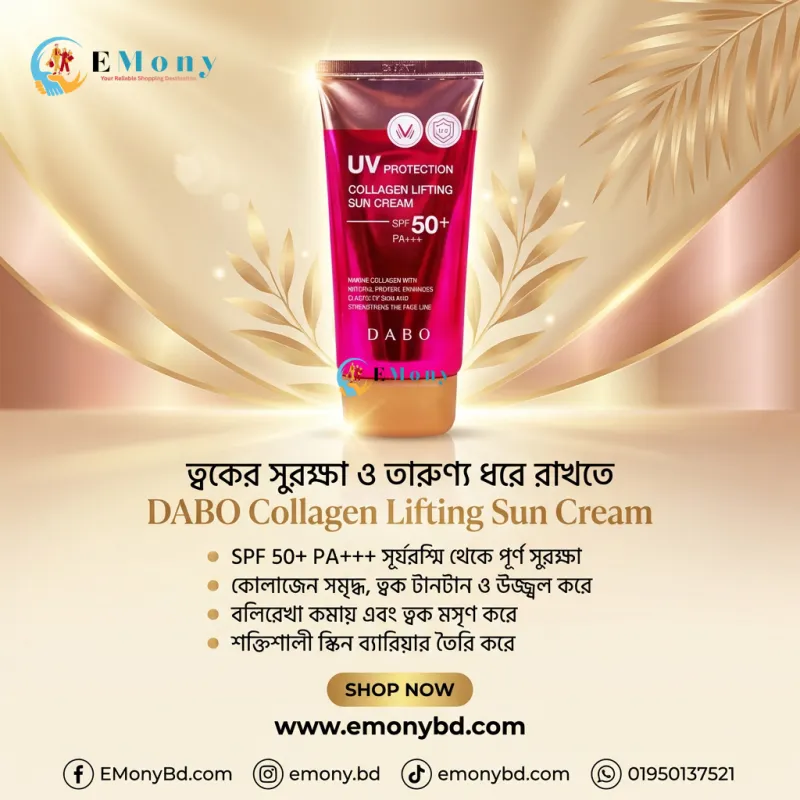 দাবো কোলাজেন লিফটিং সান ক্রিম (Dabo Collagen Lifting Sun Cream SPF50+ PA+++) আপনার ত্বককে রোদের ক্ষতিকর প্রভাব থেকে বাঁচানোর পাশাপাশি তারুণ্য ধরে রাখতে জাদুকরী কাজ করে। এই প্রিমিয়াম কোরিয়ান সানস্ক্রিনটিতে রয়েছে উচ্চমাত্রার এসপিএফ, যা কড়া রোদ, ধুলোবালি এবং দূষণ থেকে ত্বককে সম্পূর্ণ সুরক্ষিত রাখে। এর বিশেষ কোলাজেন ফর্মুলা ত্বকের ঢিলে হয়ে যাওয়া রোধ করে, রোদে পোড়া কালচে দাগ (Sunburn) দূর করে এবং স্কিনকে টানটান ও মসৃণ করে। এটি ত্বকে কোনো অতিরিক্ত তেলতেলে ভাব বা হোয়াইট কাস্ট তৈরি করে না, তাই প্রতিদিনের ব্যবহারে এটি একদম পারফেক্ট। সান ড্যামেজ এবং বয়সের ছাপ থেকে মুক্তি পেয়ে সতেজ ও উজ্জ্বল ত্বক পেতে আজই আপনার স্কিনকেয়ার রুটিনে এই অসাধারণ সান ক্রিমটি যুক্ত করুন!
