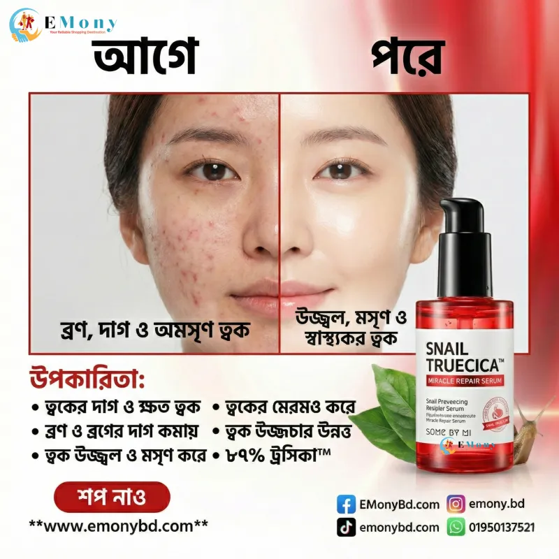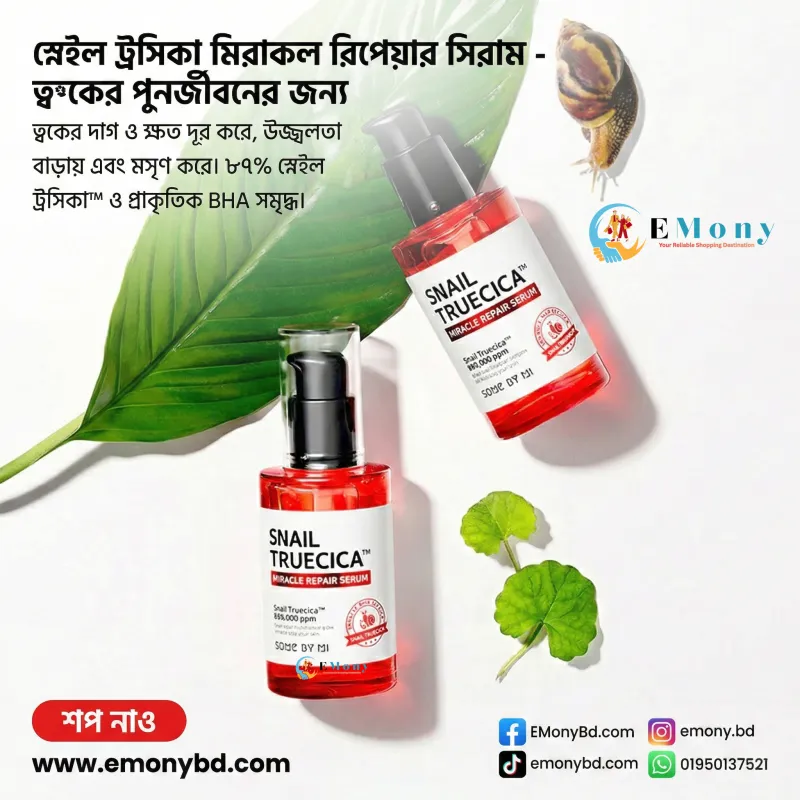 ত্বকের গর্ত (Pitting), ব্রণের জেদি কালো দাগ এবং ড্যামেজ স্কিন রিপেয়ার করার জন্য সাম বাই মি স্নেইল ট্রুশিকা মিরাকল রিপেয়ার সিরাম (Some By Mi Snail Truecica Miracle Repair Serum) কোরিয়ান স্কিনকেয়ারের একটি যুগান্তকারী পণ্য। এতে রয়েছে শক্তিশালী ৮৯% ব্ল্যাক স্নেইল মিউসিন, যা ত্বকের কোষ পুনর্গঠন করে এবং ন্যাচারাল কোলাজেন বৃদ্ধি করে ত্বকের গর্ত পূরণ করতে সাহায্য করে। পাশাপাশি এতে থাকা এক্সক্লুসিভ ট্রুশিকা (Truecica™) সেনসিটিভ, ব্রণপ্রবণ এবং লালচে ত্বককে দ্রুত শান্ত করে। স্নেইল সিরাম হলেও এটি একদমই আঠালো নয়; এটি খুব দ্রুত ত্বকের গভীরে শোষিত হয়ে ত্বককে ভেতর থেকে হাইড্রেট ও গ্লোয়িং করে তোলে। নিখুঁত ও স্বাস্থ্যোজ্জ্বল স্কিন ব্যারিয়ার পেতে এই মিরাকল সিরামটি আপনার প্রতিদিনের রুটিনের সেরা ইনভেস্টমেন্ট।