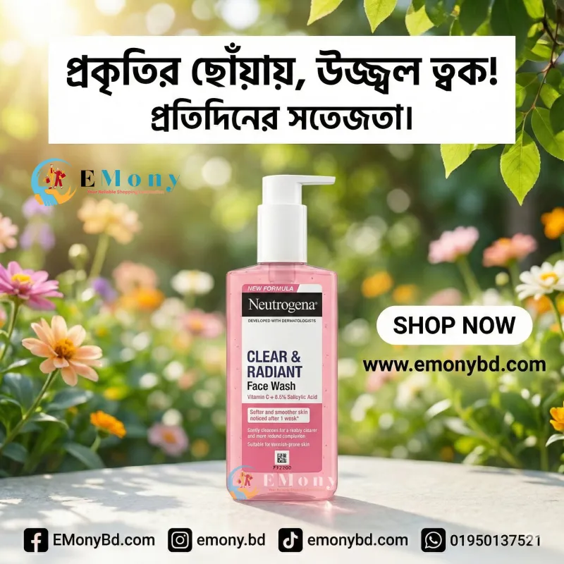 ব্রণমুক্ত এবং উজ্জ্বল ত্বকের জন্য Neutrogena Clear & Radiant Face Wash একটি অত্যন্ত কার্যকরী স্কিনকেয়ার সল্যুশন। এতে থাকা স্যালিসাইলিক অ্যাসিড (BHA) ত্বকের গভীর থেকে রোমকূপ বা পোরস পরিষ্কার করে এবং ব্রণের ব্যাকটেরিয়া ধ্বংস করে। পাশাপাশি এতে থাকা ভিটামিন সি এবং পিংক গ্রেপফ্রুট এক্সট্র্যাক্ট ত্বকের কালচে দাগ দূর করে, আনইভেন স্কিন টোন ঠিক করে এবং ত্বককে প্রাকৃতিকভাবে উজ্জ্বল ও গ্লোয়িং করে তোলে। এটি প্রতিদিন ব্যবহারে ত্বকের অতিরিক্ত তেল দূর হয় অথচ ত্বক অতিরিক্ত শুষ্ক বা রুক্ষ হয় না। যারা একই সাথে ব্রণ নিয়ন্ত্রণ এবং রেডিয়েন্ট গ্লো পেতে চান, তাদের জন্য এই ডার্মাটোলজিস্ট-টেস্টেড ফেসওয়াশটি সেরা একটি পছন্দ।