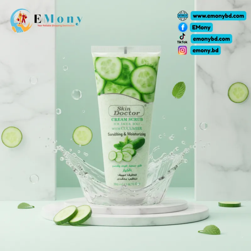 স্কিন ডক্টর ক্রিম স্ক্রাব উইথ কিউকাম্বার একটি দ্বৈত-উদ্দেশ্যমূলক স্ক্রাব যা মুখ এবং শরীরের জন্য সমানভাবে কার্যকর। সংযুক্ত আরব আমিরাত (UAE) থেকে উৎপাদিত এই স্ক্রাবটি প্রাকৃতিক শসার নির্যাস এবং এক্সফোলিয়েটিং কণা ধারণ করে। এটি ত্বককে গভীরভাবে পরিষ্কার করে, মৃত কোষ, অতিরিক্ত তেল এবং ময়লা দূর করে, যা ত্বককে সতেজ ও উজ্জ্বল করে তোলে। এর ক্রিমি টেক্সচার স্ক্রাবিংয়ের সময় ত্বককে শুষ্ক হতে দেয় না, বরং প্রয়োজনীয় আর্দ্রতা যোগায়। নিয়মিত ব্যবহারে ত্বক হয় মসৃণ, পরিষ্কার, দাগমুক্ত এবং স্বাস্থ্যকর উজ্জ্বল। সব ধরনের ত্বকের জন্য এটি উপযুক্ত।
