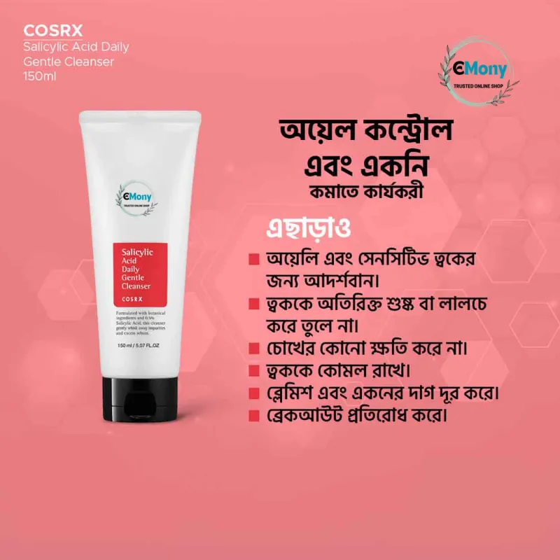 কসআরএক্স স্যালিসিলিক অ্যাসিড ডেইলি জেন্টেল ক্লেনজার ত্বকের গভীরের ময়লা, অতিরিক্ত তেল ও পোরের ভিতরের জমে থাকা অয়েল পরিষ্কার করতে সাহায্য করে। এতে থাকা স্যালিসিলিক অ্যাসিড ব্রণ, ব্ল্যাকহেড ও হোয়াইটহেড কমিয়ে ত্বককে রাখে মসৃণ ও পরিষ্কার। সংবেদনশীল ত্বকসহ সব ধরনের ত্বকে ব্যবহার করা যায় এবং দৈনিক ব্যবহারে ত্বক হয় আরও ফ্রেশ, অয়েল-ফ্রি ও সুস্থ।