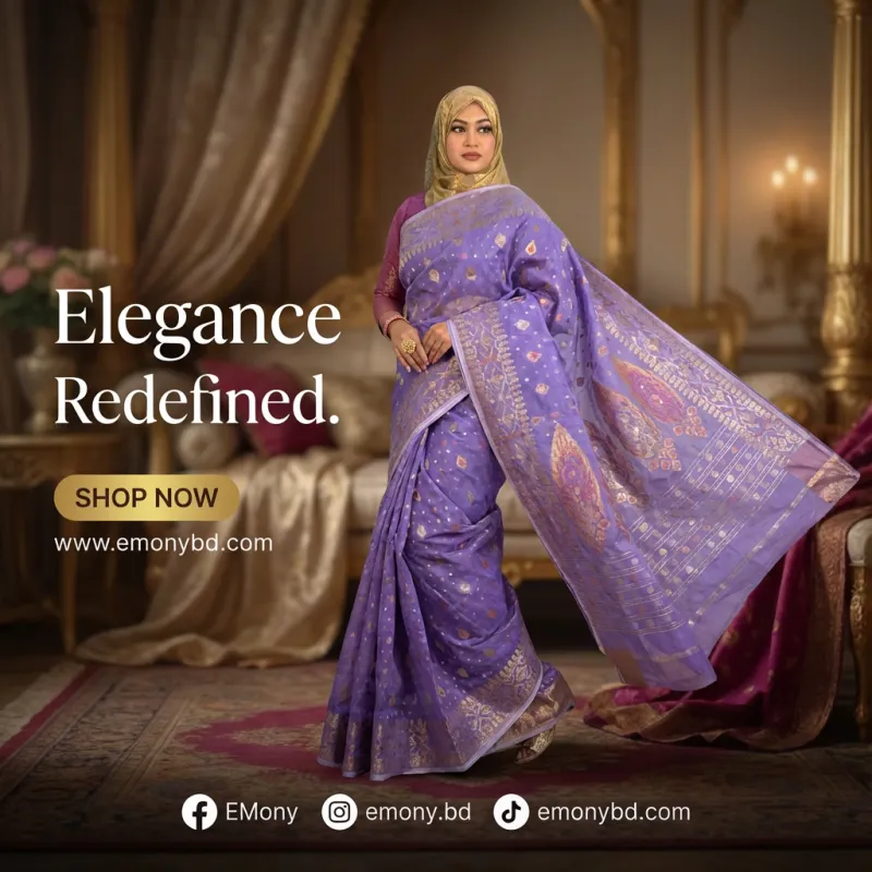 প্রিমিয়াম সিল্ক জামদানি শাড়ি (Premium Silk Jamdani Saree) বাঙালি ঐতিহ্যের সাথে আধুনিক আভিজাত্যের এক অনন্য সংমিশ্রণ। এই শাড়ির প্রতিটি সুতোয় রয়েছে সোনালী জরির (Golden Zari) নিখুঁত ও চমৎকার কারুকাজ, যা উৎসবের আলোয় আপনাকে করে তুলবে আরও আকর্ষণীয়। উন্নত মানের সফট সিল্ক ফেব্রিক ব্যবহার করায় এটি পরতে অত্যন্ত আরামদায়ক এবং সহজে গায়ের সাথে মিশে থাকে। বিয়ের অনুষ্ঠান, বিশেষ উৎসব বা ফর্মাল ইভেন্টের জন্য এটি একটি কালজয়ী পোশাক। টেকসই বুনন এবং রাজকীয় ডিজাইনের এই জামদানি শাড়িটি আপনার ওয়ার্ডরোবে আভিজাত্যের এক নতুন মাত্রা যোগ করবে।