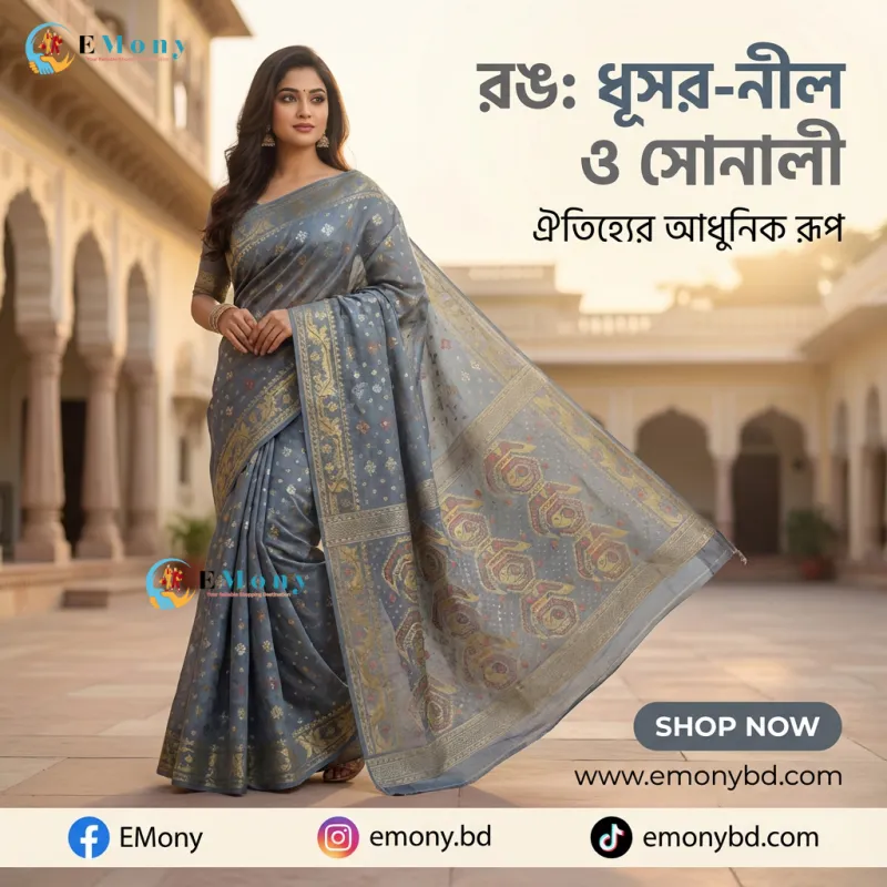 সোনালী জরির নিখুঁত কারুকাজ এবং উন্নত মানের সিল্ক কাপড়ে তৈরি এই শাড়িটি বিবাহ বা যেকোনো উৎসবে আপনাকে দেবে এক রাজকীয় ও আভিজাত্যপূর্ণ লুক।