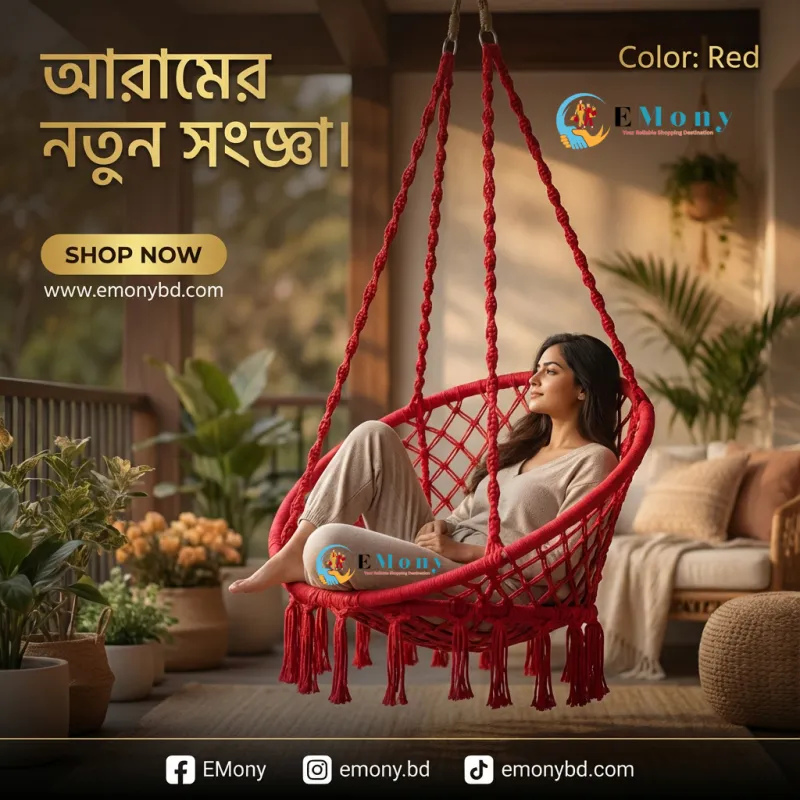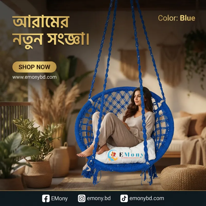 উন্নত মানের কটন রোপে তৈরি এই দোলনা চেয়ারটি ঘর বা ব্যালকনির সৌন্দর্য বাড়ায়। এটি আরামদায়ক, টেকসই এবং ইনডোর-আউটডোর ব্যবহারের উপযোগী।