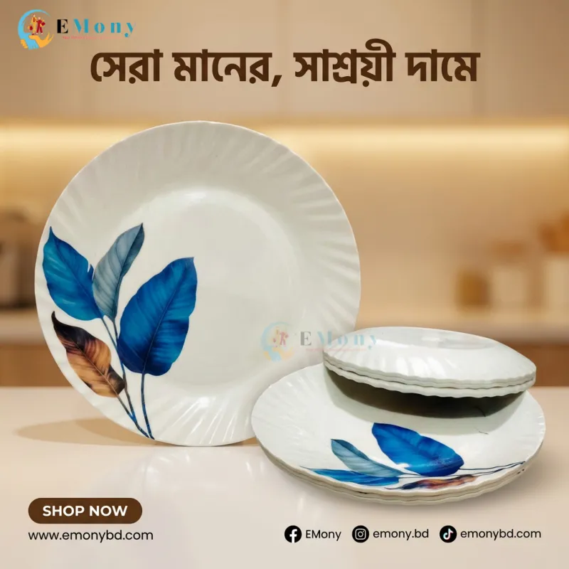 প্রিমিয়াম কোয়ালিটি মেলামাইনে তৈরি এই প্লেটগুলো সহজে ভাঙে না এবং আকর্ষণীয় নীল পাতার ডিজাইন আপনার ডাইনিংকে করে তোলে অনন্য।