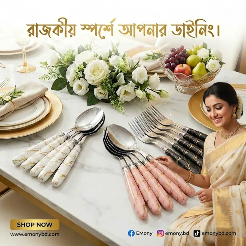আপনার ডাইনিং টেবিলের আভিজাত্য বাড়াতে প্রিমিয়াম ১২ পিসের স্টেইনলেস স্টিল চামচ ও কাঁটাচামচ সেট (Premium 12-Pcs Stainless Steel Spoon & Fork Set) একটি সেরা পছন্দ। এই সেটে রয়েছে উচ্চমানের মরিচারোধক স্টেইনলেস স্টিল, যা দীর্ঘস্থায়ী উজ্জ্বলতা নিশ্চিত করে। এর বিশেষ আকর্ষণ হলো সিরামিক ডিজাইনের সিলিকন হ্যান্ডেল, যা দেখতে অত্যন্ত নান্দনিক এবং ধরার জন্য আরামদায়ক (Non-slip grip)। এই সেটটিতে ৬টি চামচ এবং ৬টি কাঁটাচামচ রয়েছে, যা ঘরোয়া ডিনার বা মেহমানদারিতে ব্যবহারের জন্য নিখুঁত। এটি আধুনিক কিচেন ইন্টেরিয়রের সাথে যেমন মানিয়ে যায়, তেমনি প্রিয়জনকে উপহার দেওয়ার জন্যও এটি একটি লাক্সারি আইটেম।