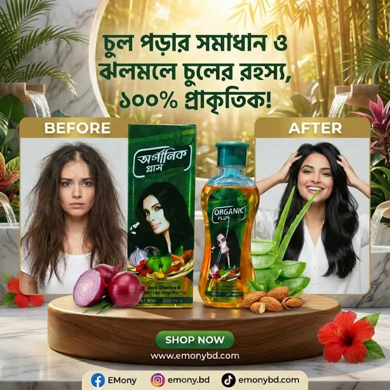আপনার চুলের যাবতীয় সমস্যার প্রাকৃতিক সমাধান দিতে অর্গানিক প্লাস হার্বাল হেয়ার অয়েল (Organic Plus Herbal Hair Oil) বিশেষভাবে তৈরি। এটি বাছাইকৃত ভেষজ উপাদানের নির্যাস থেকে প্রস্তুত, যা চুলের গভীরে পুষ্টি পৌঁছে দেয় এবং রক্ত সঞ্চালন বৃদ্ধি করে। নিয়মিত ব্যবহারে এটি মাত্র কয়েক সপ্তাহেই উল্লেখযোগ্যভাবে চুল পড়া কমিয়ে আনে এবং সুপ্ত ফলিকলকে জাগ্রত করে নতুন চুল গজাতে (Hair Regrowth) সহায়তা করে। খুশকি দূর করতে এবং চুলকে সিল্কি ও উজ্জ্বল করতে এই তেলের জুড়ি নেই। কোনো কৃত্রিম সুগন্ধি বা ক্ষতিকর কেমিক্যাল নেই বলে এটি ছোট-বড় সবার ব্যবহারের জন্য সম্পূর্ণ নিরাপদ একটি আয়ুর্বেদিক হেয়ার টনিক।