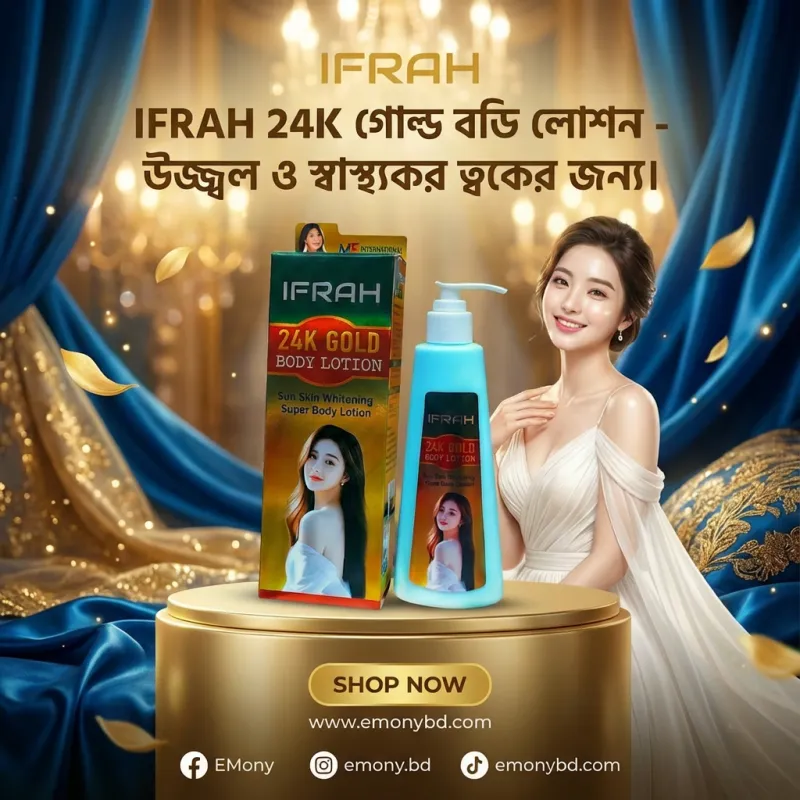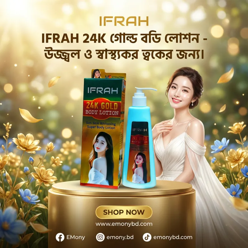 আপনার ত্বকের যত্নে আভিজাত্য এবং কার্যকারিতার সমন্বয় ঘটাতে ইফ্রাহ ২৪কে গোল্ড সান স্কিন হোয়াইটেনিং সুপার বডি লোশন (IFRAH 24K Gold Sun Skin Whitening Super Body Lotion) বিশেষভাবে তৈরি। এতে রয়েছে ২৪ ক্যারেট গোল্ড এর নির্যাস, যা ত্বকের অকাল বার্ধক্য রোধ করে এবং প্রাকৃতিকভাবে গোল্ডেন গ্লো বা উজ্জ্বলতা প্রদান করে। এই লোশনটি শুধুমাত্র ত্বক ফর্সা করে না, বরং এতে থাকা সান প্রোটেকশন উপাদান ক্ষতিকর অতিবেগুনি রশ্মি থেকে ত্বককে রক্ষা করে। এর উন্নত ফর্মুলা ত্বকের কালো দাগ ও পিগমেন্টেশন কমিয়ে আপনাকে দেয় সমান ও মসৃণ স্কিন টোন। সব ধরনের ত্বকের উপযোগী এই লোশনটি প্রতিদিন ব্যবহারে আপনার শরীর হয়ে উঠবে নরম, লাবণ্যময় এবং আকর্ষণীয়।