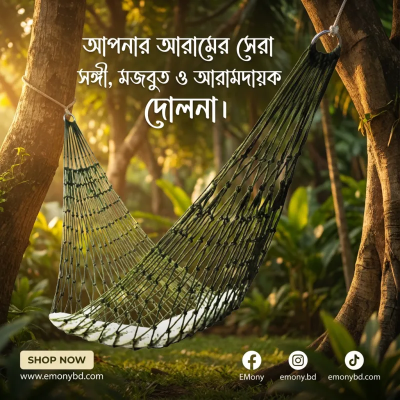 বিশ্রাম বা অবসরের সময়কে আনন্দদায়ক করতে প্রিমিয়াম আউটডোর পোর্টেবল হ্যাঙ্গিং হ্যামক রিং দোলনা (Premium Outdoor Portable Hanging Hammock Ring Dolna) একটি চমৎকার সমাধান। এই দোলনাটির বিশেষত্ব হলো এর মজবুত রিং ডিজাইন, যা একে আরও ভারসাম্যপূর্ণ এবং নিরাপদ করে তোলে। উচ্চমানের মোটা ক্যানভাস ফেব্রিক এবং শক্তিশালী দড়ি দিয়ে তৈরি এই হ্যামকটি দীর্ঘস্থায়ী এবং অনেক ওজন বহন করতে সক্ষম। এর মাল্টিকালার ডিজাইন ঘরের ড্রয়িং রুম, বারান্দা বা বাগানের শোভা বহুগুণ বাড়িয়ে দেয়। এটি ওজনে হালকা এবং সহজে বহনযোগ্য হওয়ায় ক্যাম্পিং বা পিকনিকের জন্য এটি একটি আদর্শ অনুষঙ্গ। খুব সহজেই যেকোনো হুক বা গাছের ডালে এটি ঝুলিয়ে আপনি নিতে পারেন চমৎকার দোলনার অভিজ্ঞতা।