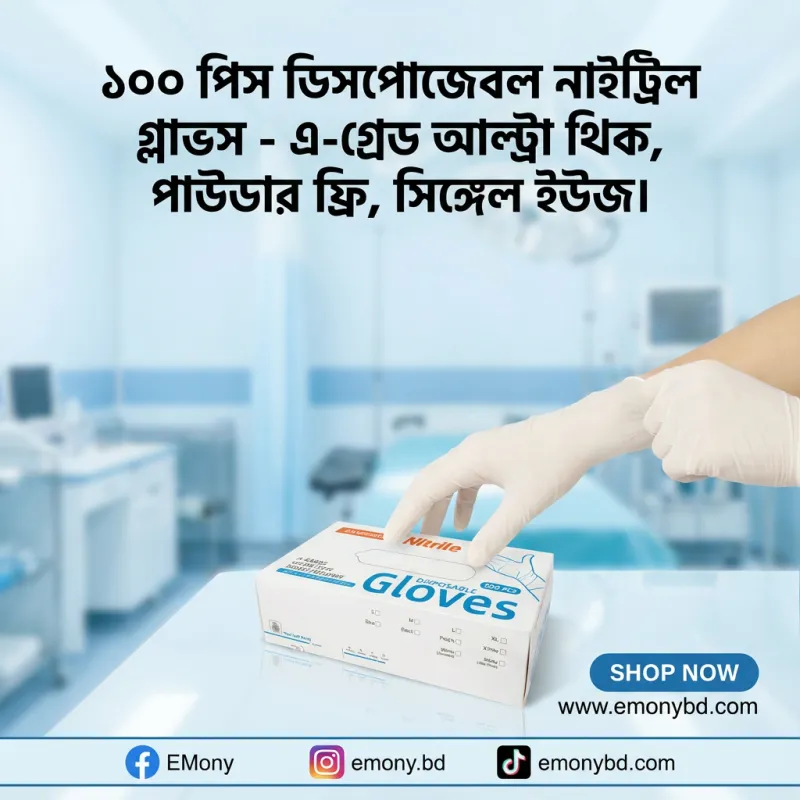 ১০০ পিসের এই বক্সে আছে এ-গ্রেড কোয়ালিটির পাউডার-ফ্রি গ্লাভস, যা ল্যাব, মেডিকেল এবং কেমিক্যাল সুরক্ষায় সর্বোচ্চ নির্ভরযোগ্য।