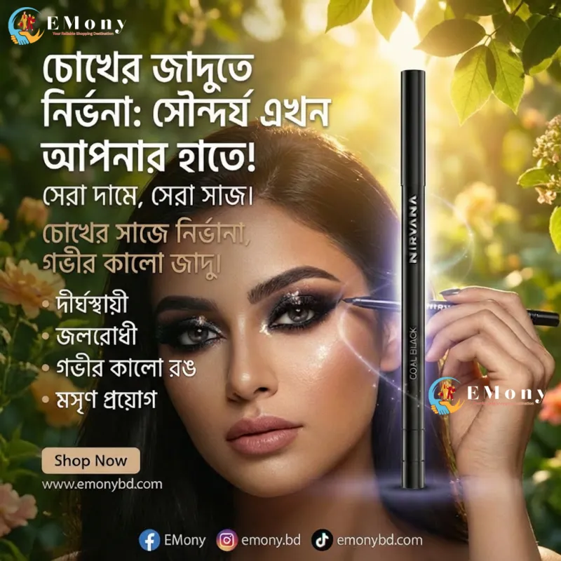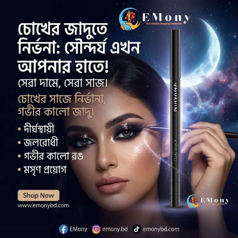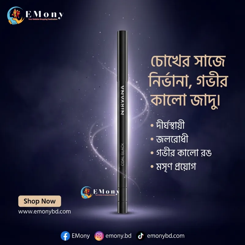 চোখের গভীরতা ও সৌন্দর্য ফুটিয়ে তুলতে নির্ভানা কোল ব্ল্যাক নো স্মাজ রিট্র্যাক্টেবল আইলাইনার (Nirvana Coal Black No Smudge Retractable Eyeliner) একটি নির্ভরযোগ্য পছন্দ। এর উচ্চমানের "কোল ব্ল্যাক" পিগমেন্টেশন চোখে এনে দেয় এক নিবিড় কালো আভা। এটি রিট্র্যাক্টেবল ডিজাইনে তৈরি, ফলে বারবার শার্প করার প্রয়োজন হয় না। এই আইলাইনারটি দীর্ঘ সময় স্থায়ী হয় এবং ঘাম বা পানিতে লেপ্টে যায় না, যা আপনাকে দেয় সারাদিন দুশ্চিন্তামুক্ত লুক। এর অত্যন্ত মসৃণ ও ক্রিমি টেক্সচার চোখের সংবেদনশীল ত্বকে খুব সহজেই প্রয়োগ করা যায়। প্রফেশনাল মেকআপ হোক বা ঘরোয়া সাজ—নির্ভানা আইলাইনার আপনার প্রতিটি লুককে করবে আরও আকর্ষণীয় ও বোল্ড।