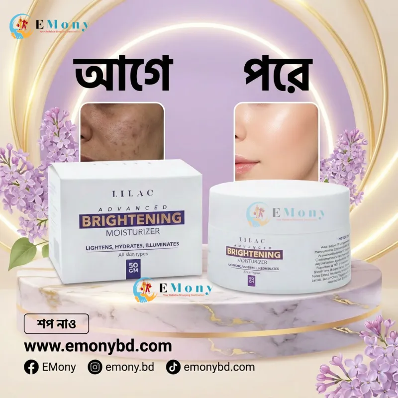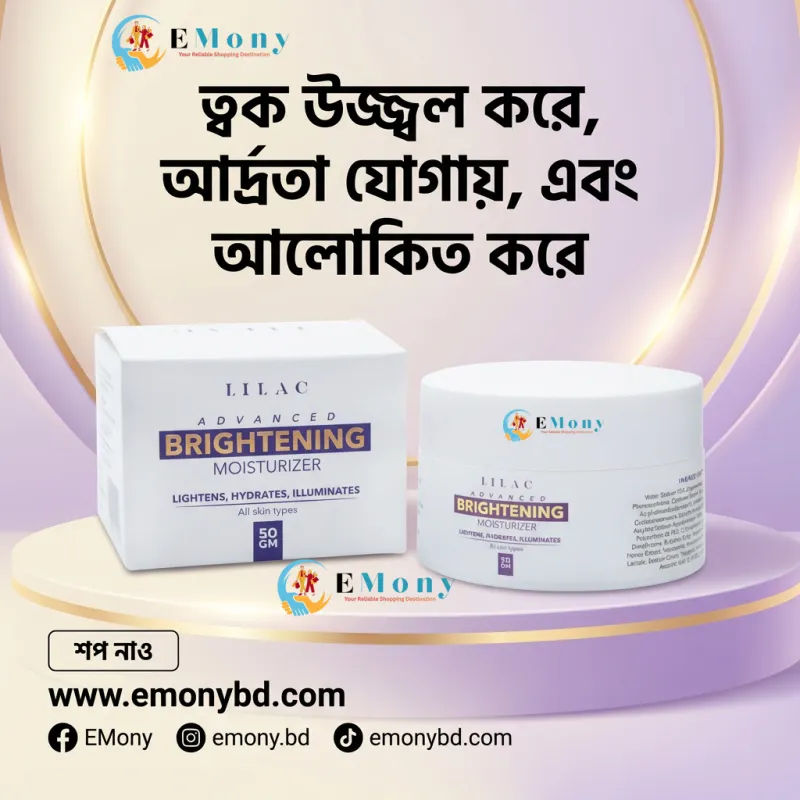 ত্বকের আর্দ্রতা বজায় রাখার পাশাপাশি প্রাকৃতিকভাবে উজ্জ্বলতা পেতে লাইলাক অ্যাডভান্সড ব্রাইটেনিং ময়েশ্চারাইজার (Lilac Advanced Brightening Moisturizer) একটি প্রিমিয়াম সমাধান। এটি বিশেষভাবে সব ধরনের ত্বকের (All Skin Types) কথা মাথায় রেখে তৈরি করা হয়েছে। এর হালকা এবং নন-গ্রিজি ফর্মুলা ত্বকের গভীরে দ্রুত শোষিত হয়ে সারাদিন হাইড্রেটেড রাখে। এতে থাকা ব্রাইটেনিং উপাদানগুলো ত্বকের অসম রঙ (Uneven Skin Tone) এবং কালচে ভাব দূর করে এক চমৎকার গ্লো প্রদান করে। প্রতিদিন ব্যবহারের ফলে ত্বক হয়ে ওঠে আরও নরম, নমনীয় এবং প্রাণবন্ত। যারা একটি নিরাপদ ও কার্যকরী ডেইলি ফেস ক্রিম খুঁজছেন, তাদের জন্য এই অ্যাডভান্সড ময়েশ্চারাইজারটি হতে পারে সেরা পছন্দ।