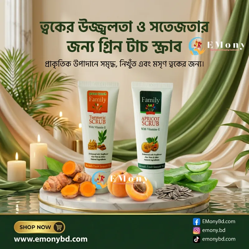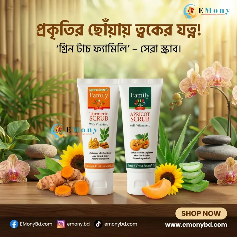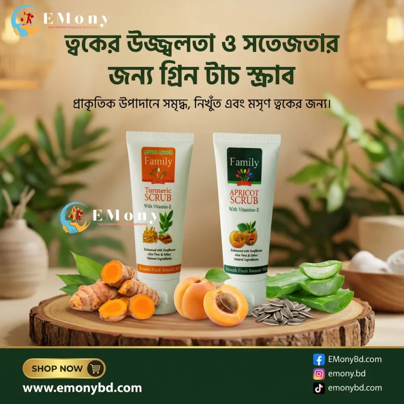 ত্বকের গভীর পরিচ্ছন্নতা এবং প্রাকৃতিক উজ্জ্বলতা ফিরিয়ে আনতে গ্রিন টাচ ফ্যামিলি টারমারিক অ্যান্ড অ্যাপ্রিকট ফেস স্ক্রাব (Green Touch Family Turmeric and Apricot Face Scrub) একটি অসাধারণ পণ্য। এতে থাকা হলুদের অ্যান্টি-সেপটিক গুণ ত্বককে ব্রণ ও ব্যাক্টেরিয়া থেকে রক্ষা করে, আর অ্যাপ্রিকটের সূক্ষ্ম কণাগুলো ত্বকের ব্ল্যাকহেডস ও মৃত কোষ কার্যকরভাবে দূর করে। বিশেষ অর্ন্তভুক্ত ভিটামিন-ই ত্বককে ব্যবহারের পর শুষ্ক হতে দেয় না, বরং প্রয়োজনীয় পুষ্টি জুগিয়ে ত্বককে রাখে নরম ও নমনীয়। সব ধরনের ত্বকের জন্য উপযোগী এই স্ক্রাবটি নিয়মিত ব্যবহারে আপনি পাবেন এক সতেজ ও প্রাণবন্ত লুক। পরিবারের সবার ব্যবহারের জন্য এটি একটি নিরাপদ ও প্রাকৃতিক স্কিনকেয়ার সলিউশন।