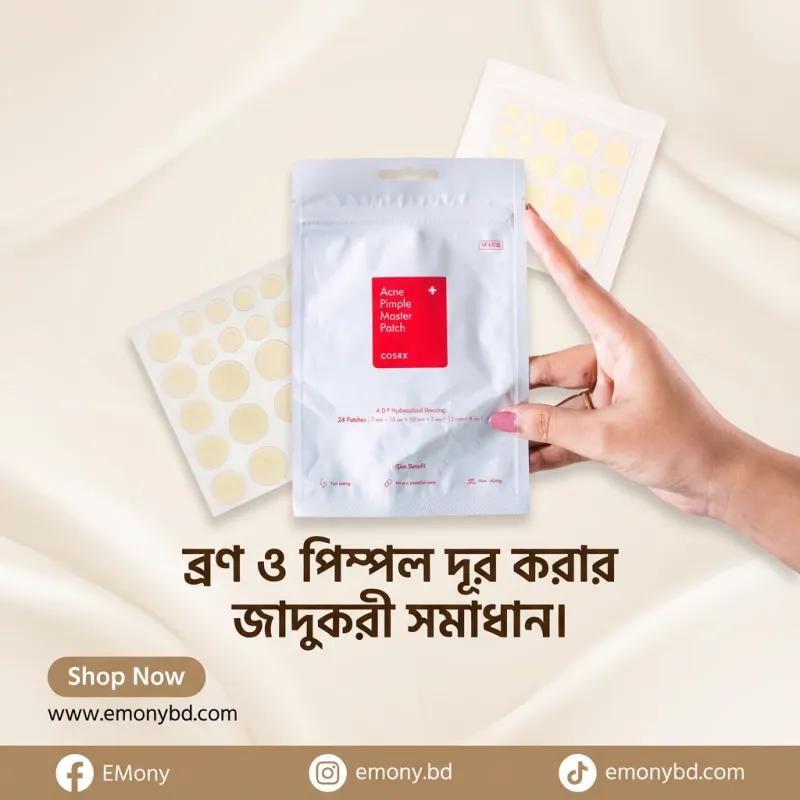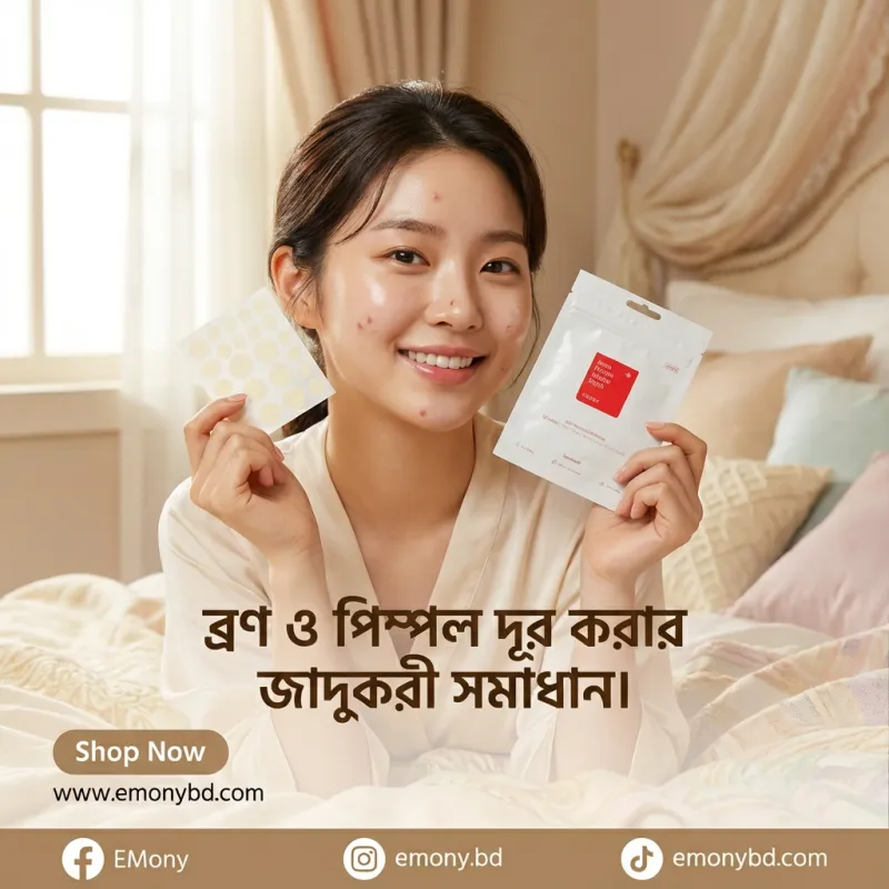 ত্বকের জন্য দ্রুত কার্যকরী সমাধান। প্যাচটি হাইড্রোকলয়েড টেকনোলজি ব্যবহার করে তৈরি, যা: পিম্পল বা ব্রেকআউটকে ঢেকে রাখে অতিরিক্ত তেল ও তরল শোষণ করে সংক্রমণ প্রতিরোধ করে দাগ ও স্কার কমাতে সহায়তা করে পাতলা ও অদৃশ্য হওয়ায় দিনের সময়েও ব্যবহারযোগ্য ব্যবহারের পদ্ধতি: ত্বক পরিষ্কার ও শুকানো অবস্থায় প্রয়োগ করুন। প্রয়োজনমতো পিম্পলের উপর প্যাচ লাগান। ৬–৮ ঘণ্টা বা রাতে ব্যবহার করুন। প্যাচ সরানোর পর ত্বক হালকা পরিষ্কার করুন। সতর্কতা: চোখে লাগানো এড়িয়ে চলুন। সংবেদনশীল ত্বকের জন্য প্রথমবারে প্যাচ টেস্ট করুন। মূল সুবিধা দ্রুত পিম্পল শুকানো 🩹 ব্ল্যাকহেড ও হোয়াইটহেড নিয়ন্ত্রণ সংক্রমণ প্রতিরোধ সহজ ও হালকা ব্যবহারের জন্য ডিজাইন করা দাগ কমাতে সহায়তা প্রোডাক্ট ফিচার পরিমাণ: 24 পিস উপযুক্ত স্কিন টাইপ: সব ধরনের ত্বক, বিশেষ করে সংবেদনশীল ত্বক প্রয়োগযোগ্য সময়: দিনে বা রাতে মূল উপাদান: হাইড্রোকলয়েড