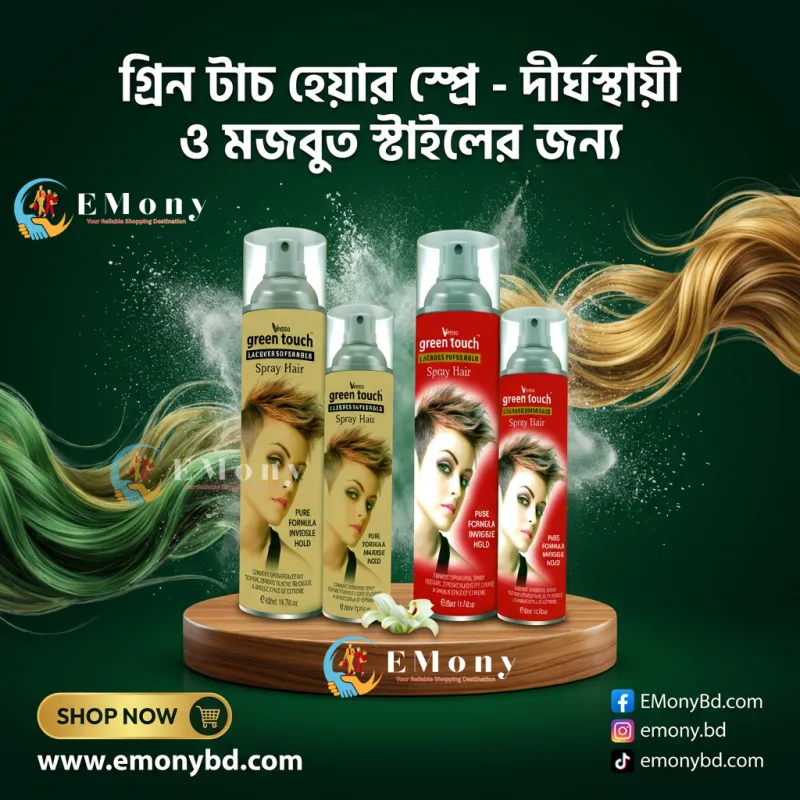 চুলের স্টাইলকে দীর্ঘক্ষণ নষ্ট হতে না দিতে গ্রিন টাচ আল্ট্রা হোল্ড হেয়ার স্টাইলিং স্প্রে (Green Touch Ultra Hold Hair Styling Spray) একটি নির্ভরযোগ্য সমাধান। এটি বিশেষভাবে তৈরি করা হয়েছে যাতে চুলের প্রতিটি স্ট্র্যান্ডকে শক্তভাবে ধরে রাখে কিন্তু দেখতে একদম স্বাভাবিক বা ন্যাচারাল মনে হয়। এর বিশেষ ফর্মুলা চুলে একটি চমৎকার জেল্লা বা "Natural Shine" যোগ করে, যা আপনার লুককে করে তোলে আরও আকর্ষণীয়। এটি দ্রুত শুকিয়ে যায় এবং চুলে কোনো সাদা আস্তরণ বা চিটচিটে ভাব তৈরি করে না। বাতাস বা আর্দ্রতাতেও চুলের সেট নষ্ট হয় না, তাই দীর্ঘ সময়ের অনুষ্ঠান বা ভ্রমণের জন্য এটি উপযুক্ত। পুরুষ ও মহিলা উভয়েই যেকোনো ধরনের হেয়ারস্টাইল সেট করতে এটি ব্যবহার করতে পারেন।