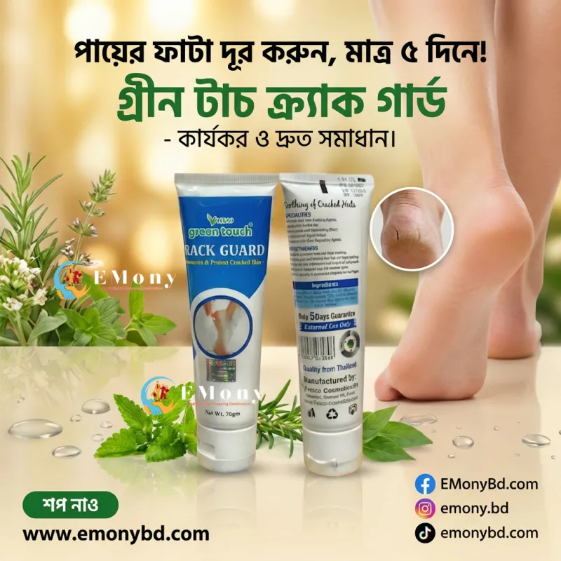 পা ফাটা এবং গোড়ালির রুক্ষতা দূর করতে গ্রিন টাচ ক্র্যাক গার্ড ফুট ক্রিম (Green Touch Crack Guard Foot Cream) একটি কার্যকরী সমাধান। শীতকাল বা শুষ্ক আবহাওয়ায় পায়ের গোড়ালি ফেটে যাওয়া একটি সাধারণ সমস্যা, যা এই ক্রিমটি নিয়মিত ব্যবহারে দ্রুত সেরে ওঠে। এর বিশেষ হিলিং ফর্মুলা ত্বকের ফাটা অংশ পূরণ করে এবং মৃত কোষ দূর করে পা-কে নরম ও রেশমী করে তোলে। এটি ত্বকের গভীরে পৌঁছে প্রয়োজনীয় আর্দ্রতা যোগায় এবং পায়ের ত্বককে পুনরায় ফাটল ধরা থেকে রক্ষা করে। নন-গ্রিজি টেক্সচারের কারণে এটি ব্যবহারের পর অস্বস্তিকর আঠালো ভাব লাগে না। মাত্র কয়েক দিনের ব্যবহারে আপনার পা হবে লক্ষণীয়ভাবে সুন্দর ও কোমল।