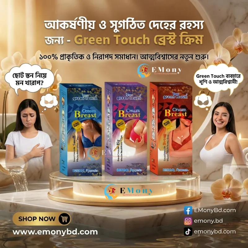 নারীদের শারীরিক গঠন ও ত্বকের যত্নে গ্রিন টাচ ব্রেস্ট ক্রিম (Green Touch Breast Cream) একটি নিরাপদ এবং কার্যকর ভেষজ সমাধান। এর বিশেষ হার্বাল ফর্মুলা ত্বকের কোলাজেন উৎপাদন বৃদ্ধি করে টিস্যুকে সুদৃঢ় (Stronger) ও টানটান রাখতে সাহায্য করে। এটি বিভিন্ন ভেরিয়েশনে পাওয়া যায় যা ভিন্ন ভিন্ন প্রয়োজন অনুযায়ী কাজ করে। প্রাকৃতিক উপাদানে সমৃদ্ধ হওয়ায় এটি ব্যবহারে কোনো পার্শ্বপ্রতিক্রিয়ার ঝুঁকি নেই। নিয়মিত ব্যবহারে এটি ত্বকের শিথিলতা দূর করে এবং একটি মসৃণ ও সুন্দর গড়ন প্রদানে সহায়তা করে। যারা প্রাকৃতিকভাবে এবং নিরাপদ উপায়ে নিজের যত্ন নিতে চান, তাদের জন্য এই ভেষজ ক্রিমটি একটি বিশ্বস্ত পছন্দ।
