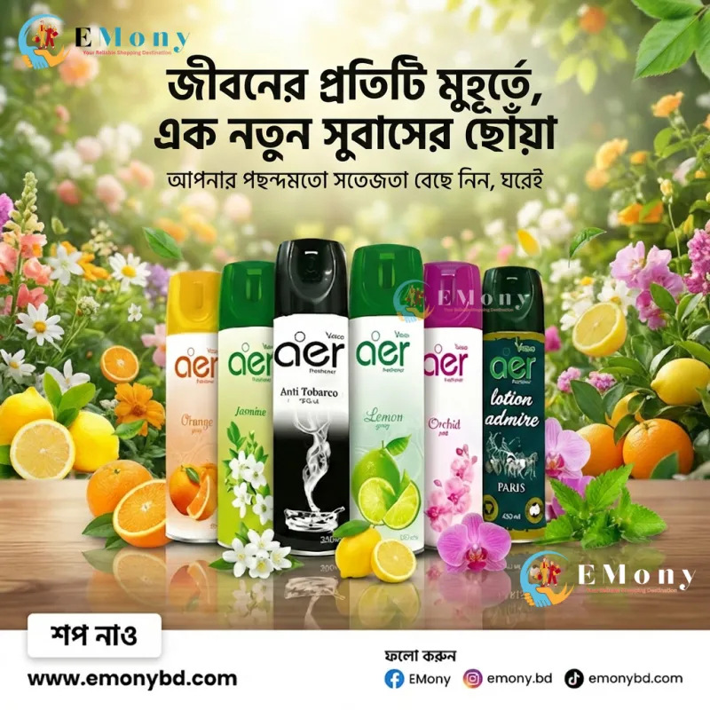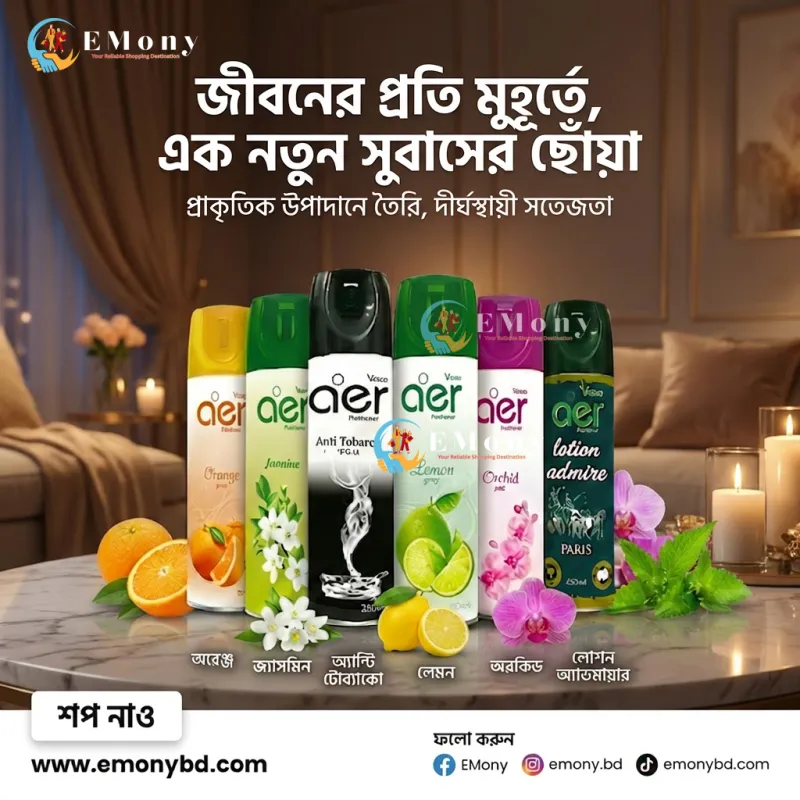 আপনার ঘর বা কর্মক্ষেত্রের পরিবেশকে সতেজ ও প্রাণবন্ত রাখতে ফ্রেসকো এয়ার প্রিমিয়াম এয়ার ফ্রেশনার (Fresko aer Premium Air Freshener) একটি সেরা পছন্দ। এটি উন্নত প্রযুক্তিতে তৈরি যা বাতাসের দুর্গন্ধকে ঢেকে না দিয়ে সরাসরি দূর করে। আপনার পছন্দ অনুযায়ী এতে রয়েছে Orange, Jasmine, Anti-Tobacco, Lemon, Orchid, এবং Lotion Admire Paris-এর মতো বৈচিত্র্যময় ফ্লেভার। বিশেষ করে 'অ্যান্টি-টোব্যাকো' ভেরিয়েন্টটি ধূমপানের গন্ধ দূর করতে অত্যন্ত কার্যকর। এর প্রতিটি স্প্রে দীর্ঘ সময় স্থায়ী হয় এবং এক রাজকীয় সুগন্ধি আবেশ ছড়িয়ে দেয়। লিভিং রুম, বেডরুম কিংবা ওয়াশরুম—যেকোনো স্থানকে তাৎক্ষণিক রিফ্রেশ করতে এই ৩০০ মি.লি. প্যাকটি অত্যন্ত সাশ্রয়ী ও কার্যকরী।