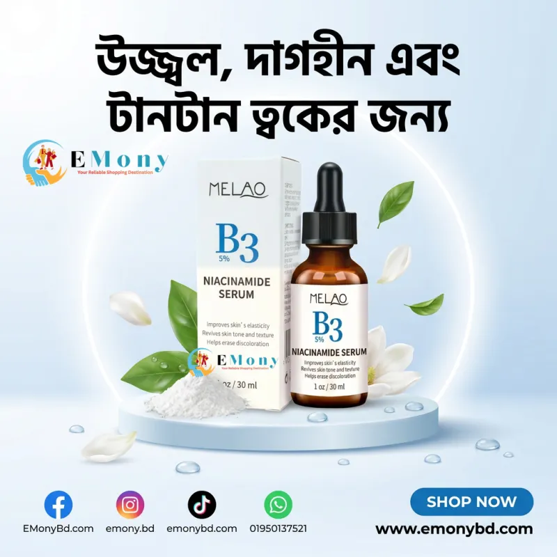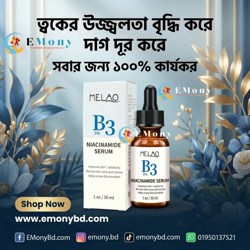 ত্বকের ছিদ্র বা ওপেন পোরস এবং কালচে দাগের সমস্যায় মেলাও B3 ৫% নিয়াসিনামাইড সিরাম (Melao B3 5% Niacinamide Serum) একটি অত্যন্ত কার্যকর সমাধান। নিয়াসিনামাইড বা ভিটামিন B3 ত্বকের সিবাম প্রোডাকশন নিয়ন্ত্রণ করে, যা অতিরিক্ত তৈলাক্ত ভাব কমাতে সাহায্য করে। এটি ত্বকের টেক্সচার উন্নত করে এবং ব্রণের লালচে ভাব বা পিম্পল মার্কস দূর করতে দারুণ কাজ করে। ৩০ মি.লি.-এর এই সিরামটি ত্বকের ন্যাচারাল ব্যারিয়ার শক্তিশালী করে, ফলে ত্বক বাইরের ধুলোবালি ও জীবাণু থেকে রক্ষা পায়। সব ধরনের ত্বকের জন্য উপযোগী এই সিরামটি নিয়মিত ব্যবহারে আপনি পাবেন আরও মসৃণ, সতেজ এবং উজ্জ্বল ত্বক।