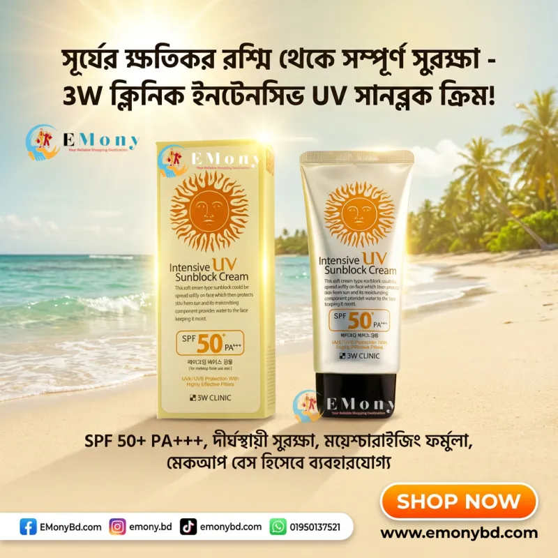 সূর্যের ক্ষতিকর আল্ট্রাভায়োলেট রশ্মি থেকে ত্বককে সুরক্ষিত রাখতে 3W ক্লিনিক ইনটেনসিভ ইউভি সানব্লক ক্রিম (3W Clinic Intensive UV Sunblock Cream) একটি জনপ্রিয় কোরিয়ান স্কিনকেয়ার সমাধান। এর SPF 50+ PA+++ ফর্মুলা ত্বককে রোদে পোড়া (Sunburn) এবং অকাল বার্ধক্য (Aging) থেকে কার্যকরভাবে রক্ষা করে। এটি কেবল একটি সানস্ক্রিন নয়, এতে থাকা অ্যালোভেরা এবং রেড জিনসেং নির্যাস ত্বককে হাইড্রেটেড ও শান্ত রাখে। এর বিশেষ টেক্সচার ত্বকে সাদা আস্তরণ (White cast) ফেলে না এবং চিটচিটে ভাব ছাড়াই দীর্ঘক্ষণ স্থায়ী হয়। যারা প্রতিদিন রোদে বের হন বা মেকআপের নিচে একটি ভালো বেস চান, তাদের জন্য এই সানব্লকটি সেরা পছন্দ।