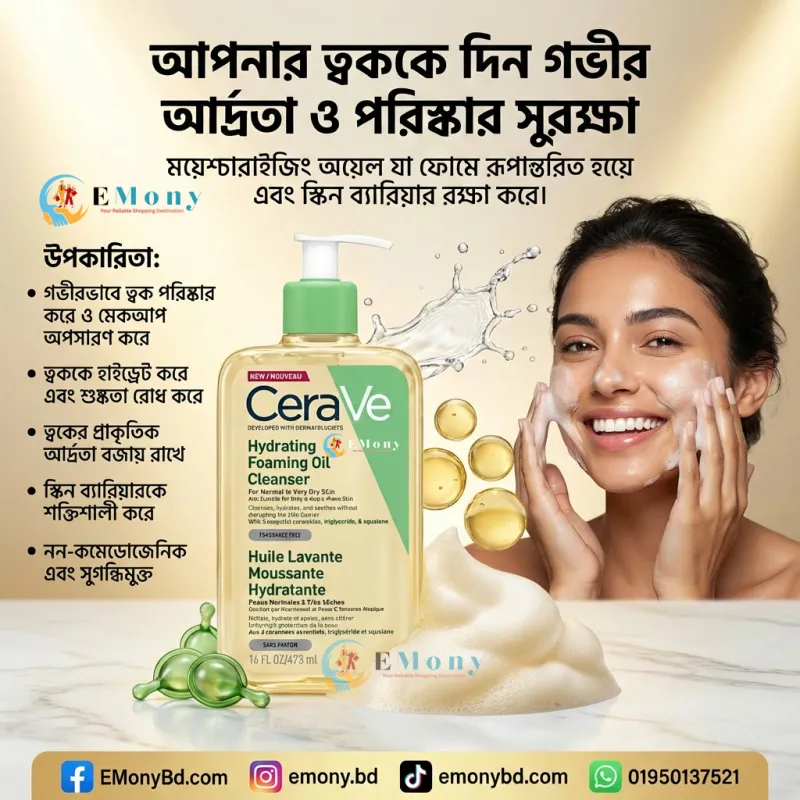 শুষ্ক ও সংবেদনশীল ত্বকের জন্য সেরাভি হাইড্রেটিং ফোমিং অয়েল ক্লিনজার (CeraVe Hydrating Foaming Oil Cleanser) একটি অত্যন্ত কার্যকর এবং কোমল ক্লিনজার। এর অনন্য অয়েল-টু-ফোম ফর্মুলা ত্বক থেকে মেকআপ, সানস্ক্রিন এবং অতিরিক্ত তেল দূর করে কোনো ধরনের টানটান অনুভূতি ছাড়াই। এতে রয়েছে স্কোয়ালেন অয়েল (Squalane Oil) এবং ট্রাইগ্লিসারাইড, যা ত্বককে পুষ্টি যোগায়। এছাড়াও এটি ৩টি এসেনশিয়াল সিরামাইড এবং হায়ালুরোনিক অ্যাসিড সমৃদ্ধ, যা ত্বকের ন্যাচারাল ব্যারিয়ার রক্ষা করে। এটি সাবানমুক্ত, সুগন্ধিমুক্ত এবং প্যারাফেন-মুক্ত হওয়ায় শিশু থেকে প্রাপ্তবয়স্ক—সবার ত্বকের জন্য এবং এমনকি অ্যাটোপিক-প্রবণ ত্বকেও ব্যবহারের উপযোগী।