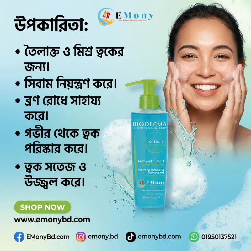 তৈলাক্ত এবং একনি-প্রবণ ত্বকের যত্নে বায়োডার্মা সেবিয়াম জেল মুসান্ত (Bioderma Sébium Gel Moussant) একটি বিশ্বস্ত নাম। এটি বিশেষভাবে তৈরি করা হয়েছে ত্বকের প্রাকৃতিক তেলের ভারসাম্য বজায় রেখে গভীর থেকে ময়লা পরিষ্কার করার জন্য। এর বিশেষ Fluidactiv™ কমপ্লেক্স সিবামের মান উন্নত করে, ফলে পোরস বা রোমকূপ বন্ধ হওয়া রোধ হয় এবং ব্রণের উপদ্রব কমে। এতে থাকা জিঙ্ক সালফেট এবং কপার সালফেট ত্বককে পিউরিফাই বা জীবাণুমুক্ত করে। এটি সোপ-ফ্রি এবং প্যারাবেন-মুক্ত, তাই ত্বক অতিরিক্ত শুষ্ক না করেই সতেজ অনুভূতি দেয়। সুস্থ ও ব্রণমুক্ত ত্বকের জন্য এই ক্লিনজারটি আপনার প্রতিদিনের রুটিনের সেরা অংশ হতে পারে।