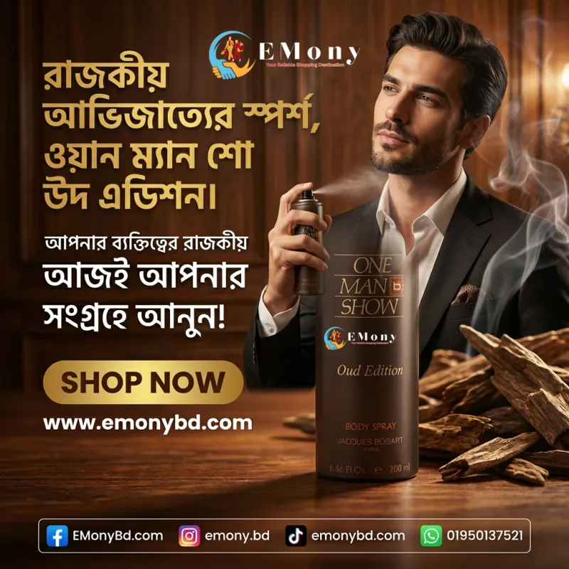 আভিজাত্য এবং রাজকীয় সুগন্ধের খোঁজে থাকা পুরুষদের জন্য ওয়ান ম্যান শো আউদ এডিশন (One Man Show Oud Edition) একটি আদর্শ পছন্দ। ফ্রান্সের বিখ্যাত ব্র্যান্ড জ্যাকেস বোগার্টের এই বডি স্প্রেটি আউদ (Oud) বা আগরকাঠের কড়া ও রাজকীয় ঘ্রাণ সমৃদ্ধ। এতে আউদের পাশাপাশি স্পাইসি এবং উডি নোটের এক অসাধারণ সমন্বয় রয়েছে, যা আপনাকে দেয় এক দীর্ঘস্থায়ী এবং শক্তিশালী পুরুষালী ব্যক্তিত্ব। ২০০ মি.লি.-এর এই 'হাইলি পারফিউমড' বডি স্প্রেটি সাধারণ ব্যবহারের পাশাপাশি যেকোনো জমকালো অনুষ্ঠানে ব্যবহারের জন্য চমৎকার। যারা একটু কড়া এবং ক্ল্যাসিক সুগন্ধ পছন্দ করেন, তাদের কালেকশনে এই আউদ এডিশনটি থাকা আবশ্যক।