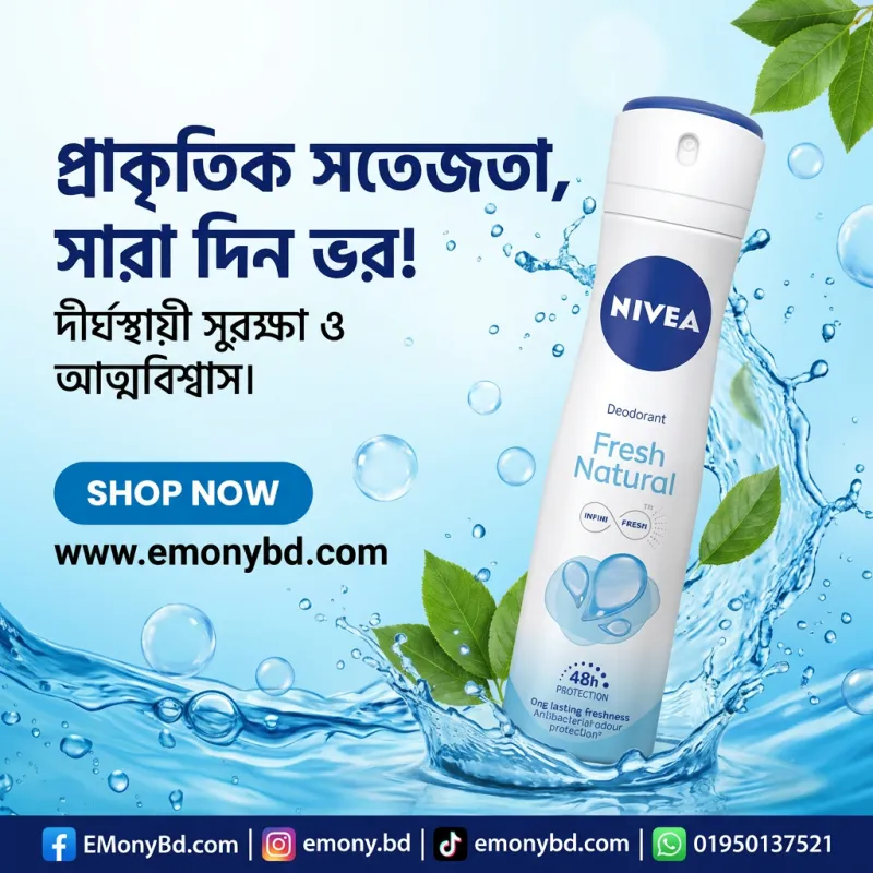 সারা দিন সতেজ এবং দুর্গন্ধমুক্ত থাকতে নিভিয়া ফ্রেশ ন্যাচারাল ডিওডোরেন্ট (Nivea Fresh Natural Deodorant) একটি নির্ভরযোগ্য সমাধান। এতে থাকা উন্নত Infini Fresh Technology এবং সমুদ্রের খনিজ নির্যাস (Ocean Extracts) আপনাকে দেয় ৪৮ ঘণ্টার দীর্ঘস্থায়ী সুরক্ষা। এটি ত্বকে কোনো কৃত্রিম রং বা প্রিজারভেটিভ ছাড়াই প্রাকৃতিক সতেজতা নিশ্চিত করে। নিভিয়ার এই ডিওডোরেন্টটি চর্মরোগ বিশেষজ্ঞ দ্বারা পরীক্ষিত, তাই এটি ত্বকের জন্য সম্পূর্ণ নিরাপদ এবং জ্বালাপোড়া মুক্ত। আপনি যদি এমন একটি বডি স্প্রে খুঁজছেন যা হালকা অথচ সতেজ সুগন্ধ দেবে এবং আপনার আত্মবিশ্বাস ধরে রাখবে, তবে এটি আপনার জন্য সেরা পছন্দ।