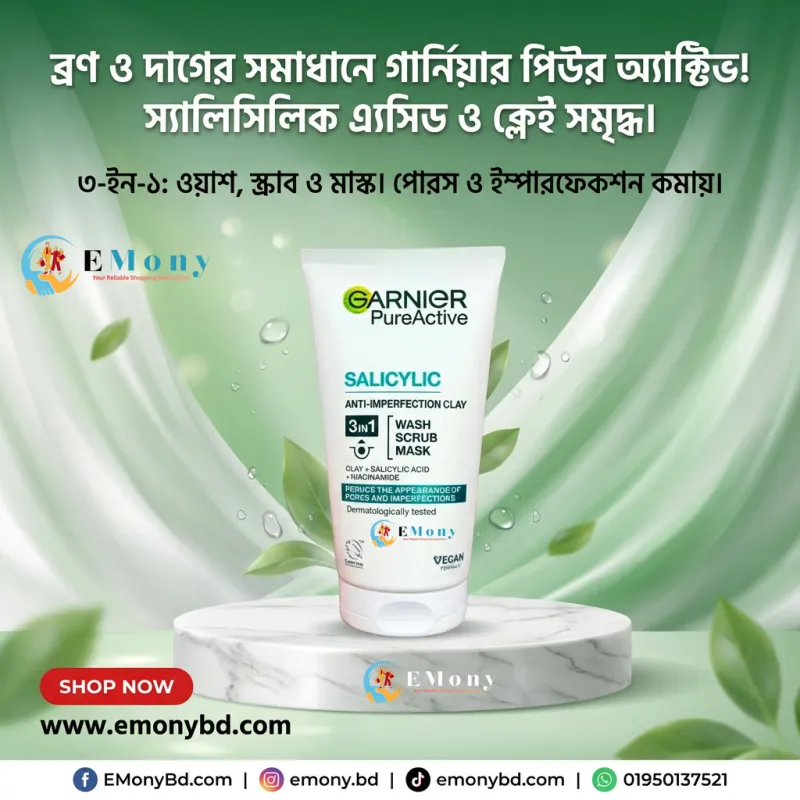 যাদের ত্বকে অতিরিক্ত তেল এবং ব্রণের সমস্যা রয়েছে, তাদের জন্য গার্নিয়ার পিওর অ্যাক্টিভ ৩-ইন-১ ক্লে (Garnier Pure Active 3-in-1 Anti-Imperfection Clay) একটি অল-ইন-ওয়ান সমাধান। এতে রয়েছে স্যালিসাইলিক অ্যাসিড, যা ব্রণের বিরুদ্ধে লড়াই করে এবং নিয়াসিনামাইড, যা ত্বকের দাগ দূর করে উজ্জ্বলতা বাড়ায়। এটি তিনটি উপায়ে ব্যবহার করা যায়— প্রতিদিনের ওয়াশ হিসেবে ময়লা দূর করতে, স্ক্রাব হিসেবে ব্ল্যাকহেডস কমাতে এবং মাস্ক হিসেবে ত্বকের অতিরিক্ত তেল শুষে নিয়ে ম্যাট ফিনিশ দিতে। মাত্র ১টি প্রোডাক্ট ব্যবহার করেই আপনি পাবেন পরিষ্কার, মসৃণ এবং ব্রনমুক্ত ফ্রেশ ত্বক।