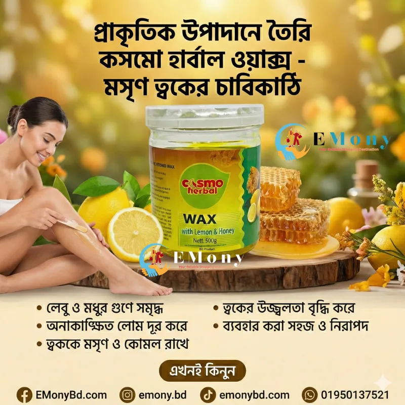 কসমো হারবাল লেমন অ্যান্ড হানি ওয়াক্স (৫০০ গ্রাম) আপনার ত্বককে দেয় দীর্ঘস্থায়ী মসৃণতা এবং প্রাকৃতিক উজ্জ্বলতা। লেবু এবং মধুর অনন্য সংমিশ্রণে তৈরি এই ওয়াক্সটি খুব সহজেই শরীরের অবাঞ্ছিত লোম গোড়া থেকে পরিষ্কার করে। লেবুতে থাকা প্রাকৃতিক ব্লিচিং প্রপার্টিজ এবং ভিটামিন সি ত্বকের কালচে ভাব দূর করে গ্লোয়িং লুক দেয়। অন্যদিকে, মধুর অ্যান্টিব্যাকটেরিয়াল এবং ময়েশ্চারাইজিং গুণ ত্বককে ওয়াক্সিংয়ের পর রাখে একদম নরম, কোমল ও হাইড্রেটেড। এটি ব্যবহারের পর ত্বকে কোনো রকম শুষ্ক ভাব বা ইরিটেশন থাকে না। সব ধরনের ত্বকের জন্য উপযোগী এই হারবাল ওয়াক্সটি ঘরে বসেই আপনাকে দেবে পারফেক্ট ও ব্যথামুক্ত হেয়ার রিমুভাল এক্সপেরিয়েন্স। সুন্দর, মসৃণ ও উজ্জ্বল ত্বক পেতে আজই আপনার রুটিনে যোগ করুন!