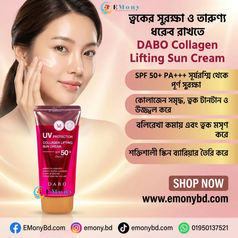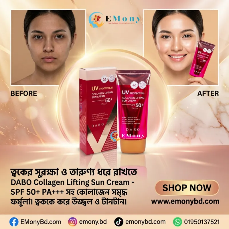দাবো কোলাজেন লিফটিং সান ক্রিম (Dabo Collagen Lifting Sun Cream SPF50+ PA+++) আপনার ত্বককে রোদের ক্ষতিকর প্রভাব থেকে বাঁচানোর পাশাপাশি তারুণ্য ধরে রাখতে জাদুকরী কাজ করে। এই প্রিমিয়াম কোরিয়ান সানস্ক্রিনটিতে রয়েছে উচ্চমাত্রার এসপিএফ, যা কড়া রোদ, ধুলোবালি এবং দূষণ থেকে ত্বককে সম্পূর্ণ সুরক্ষিত রাখে। এর বিশেষ কোলাজেন ফর্মুলা ত্বকের ঢিলে হয়ে যাওয়া রোধ করে, রোদে পোড়া কালচে দাগ (Sunburn) দূর করে এবং স্কিনকে টানটান ও মসৃণ করে। এটি ত্বকে কোনো অতিরিক্ত তেলতেলে ভাব বা হোয়াইট কাস্ট তৈরি করে না, তাই প্রতিদিনের ব্যবহারে এটি একদম পারফেক্ট। সান ড্যামেজ এবং বয়সের ছাপ থেকে মুক্তি পেয়ে সতেজ ও উজ্জ্বল ত্বক পেতে আজই আপনার স্কিনকেয়ার রুটিনে এই অসাধারণ সান ক্রিমটি যুক্ত করুন!